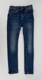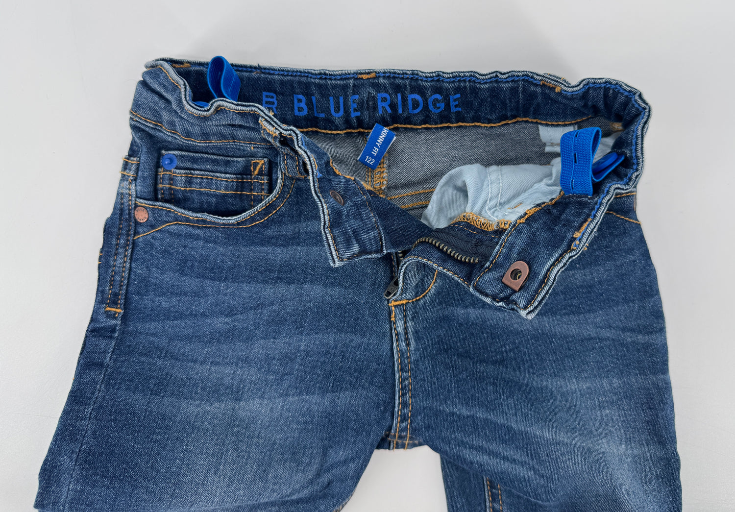 Blauwe ultra skinny jeans van Blue Ridge in maat 122. De broek sluit met een rits en schuifknoop en is binnenin met elastiek verstelbaar.