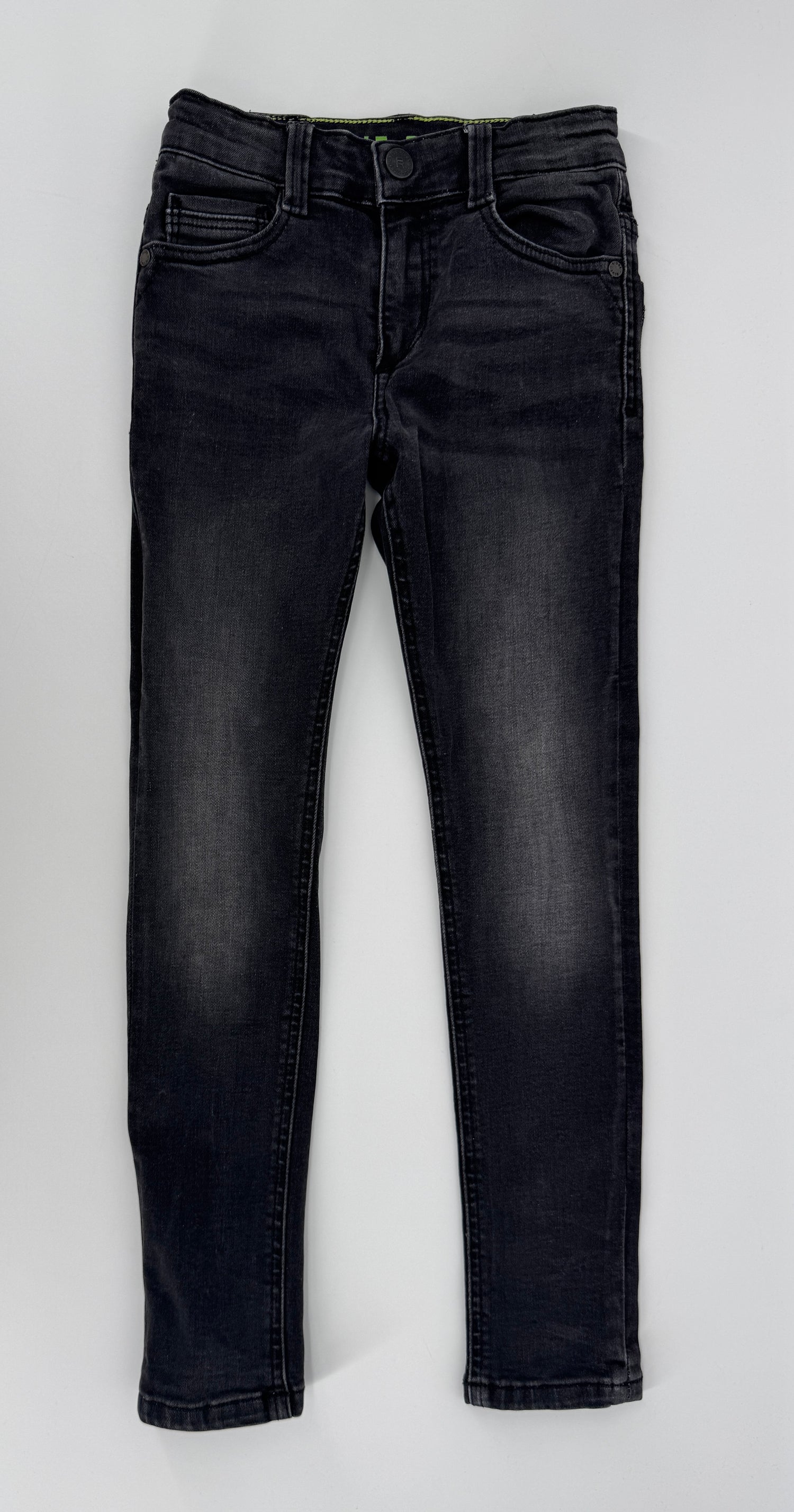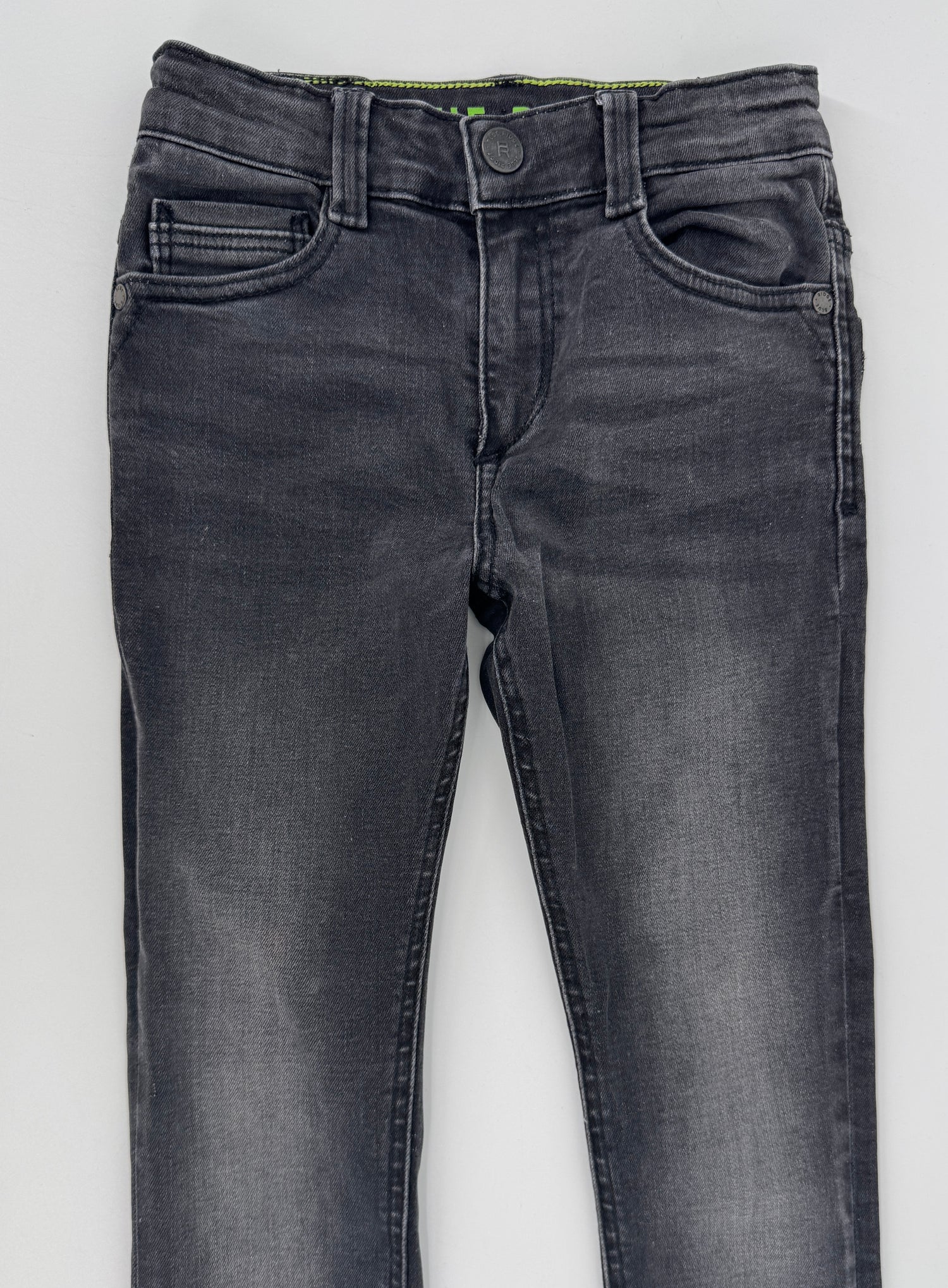 Donkergrijze ultra skinny jeans van Blue Ridge in maat 122. De broek sluit met een rits en schuifknoop en is binnenin met elastiek verstelbaar.