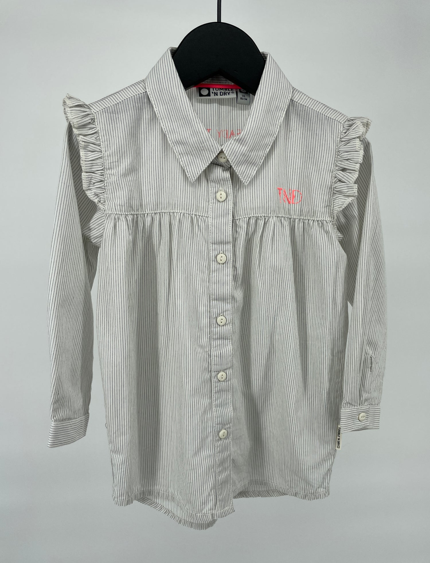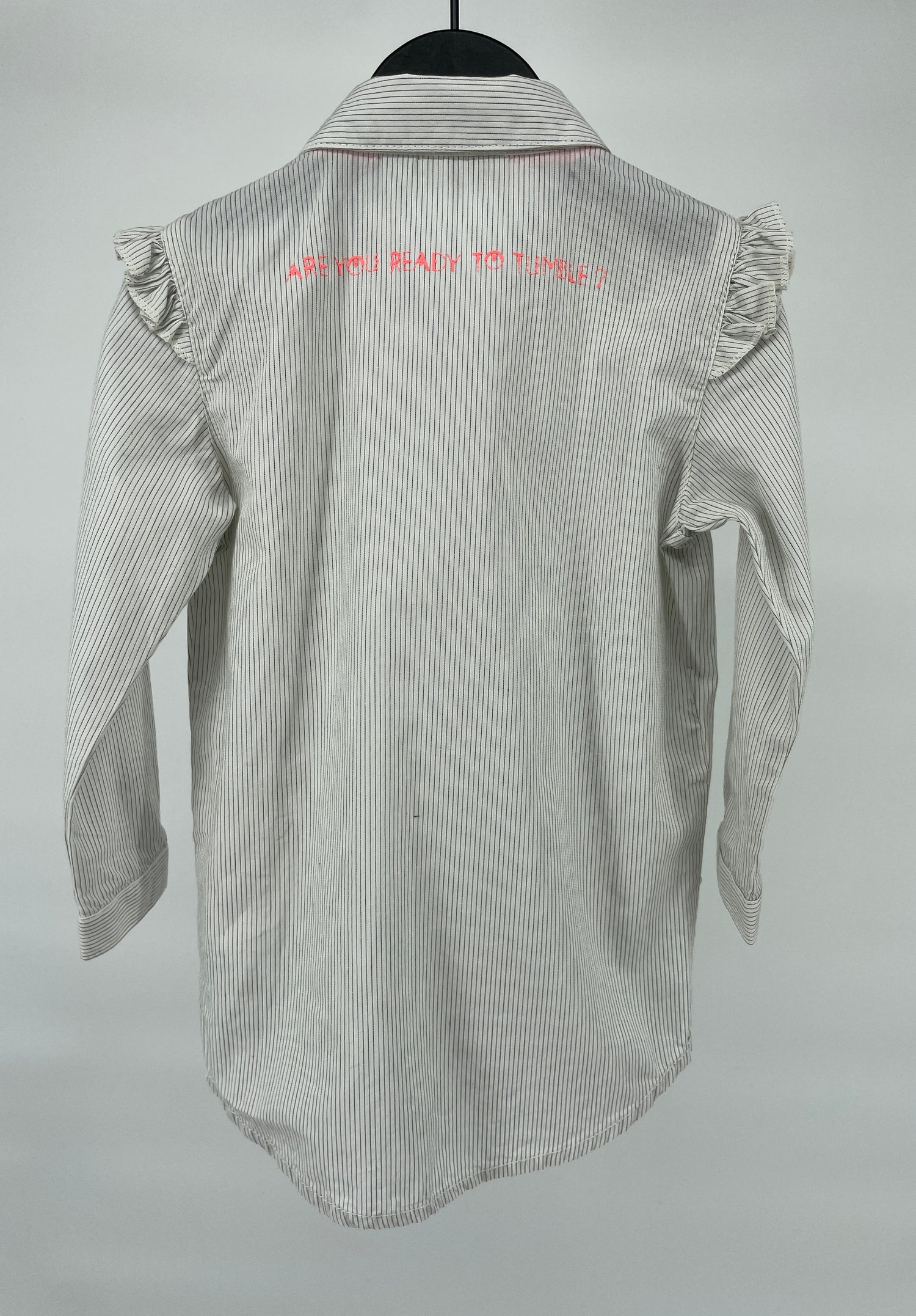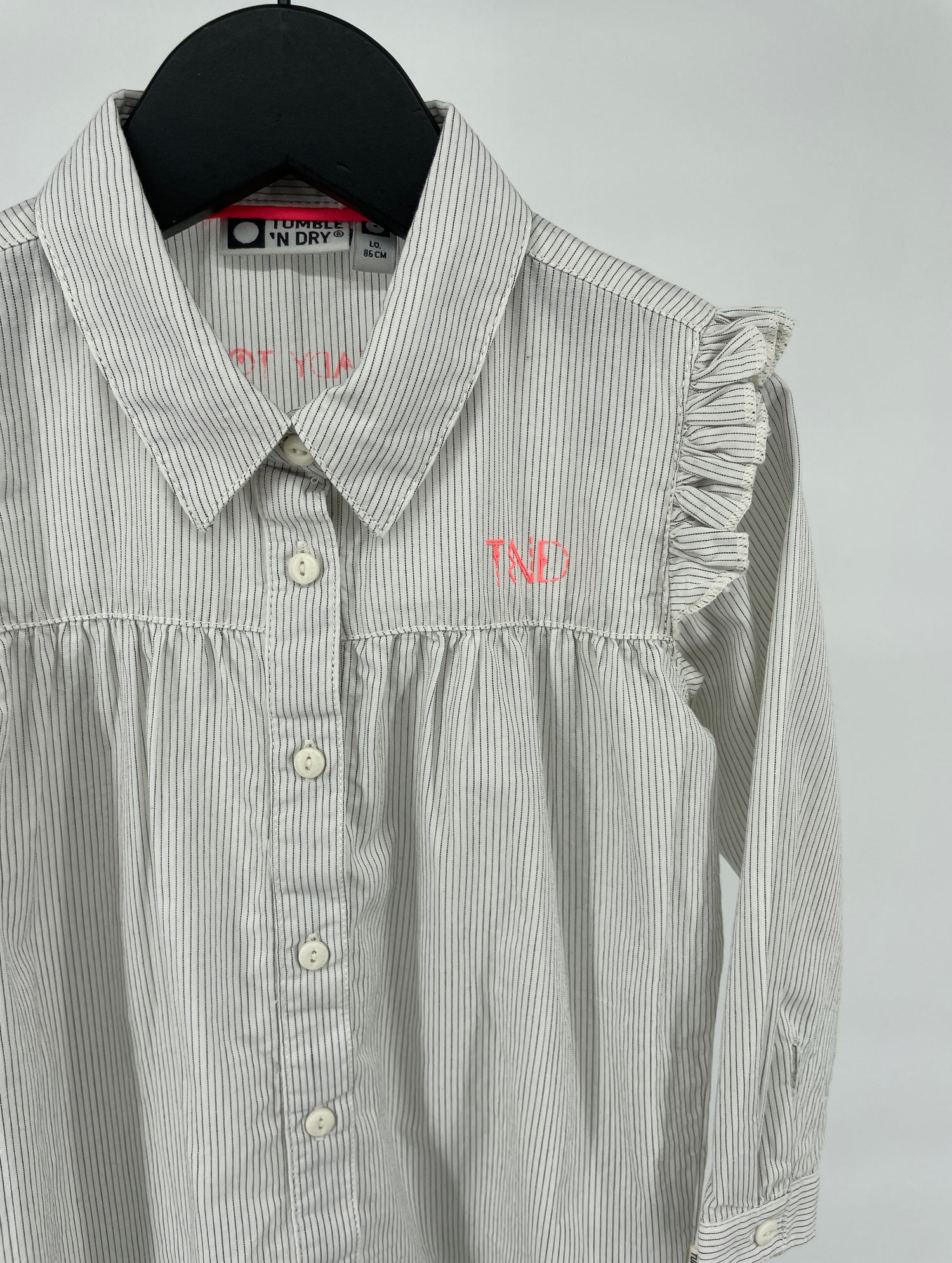 Beige blouse jurk van Tumble ’n Dry in maat 86. Hij is uitgevoerd in beige stof met een heel dun zwart streepje, zie foto’s. Op de schouders bij de mouwinzet zitten roesjes en kleine plooitjes op de borst, zie foto’s. De blouse heeft diverse licht roze accenten, en bovenaan de rug de tekst ‘are you ready to tumble?’.