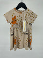 Beige jurkje met korte mouwtjes en 'cat advice' print van Mini Rodini in maat 68 / 74. Hij sluit op de rug met 3 drukkers.