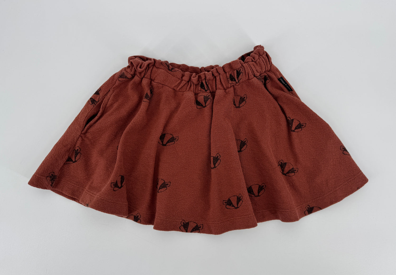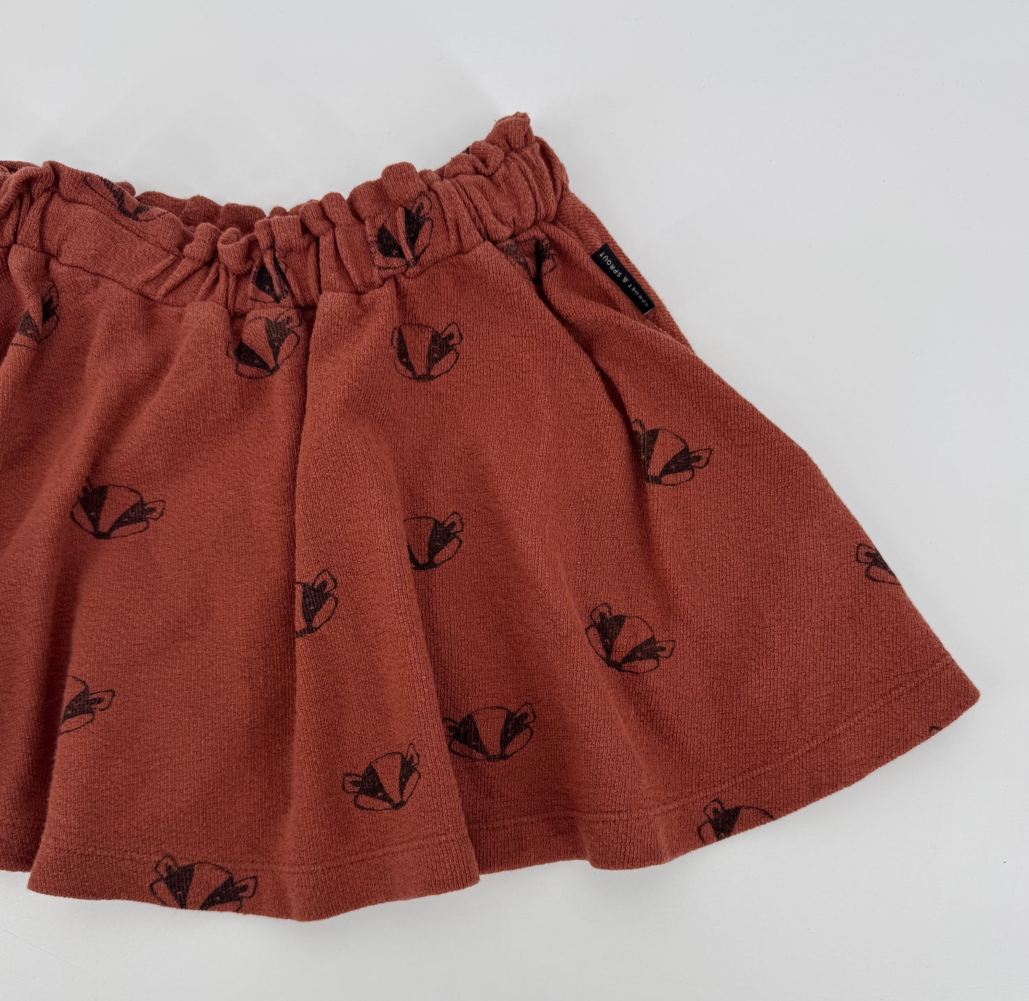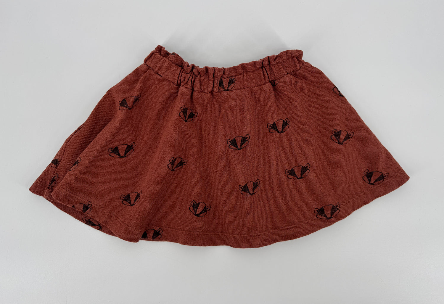 Bruin badstof rokje met all over dassen print van Sproet & Spruit in maat 104. Hij heeft een elastische tailleband en is binnenin met elastiek verstelbaar. Met zakken aan de zijkanten.