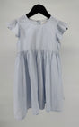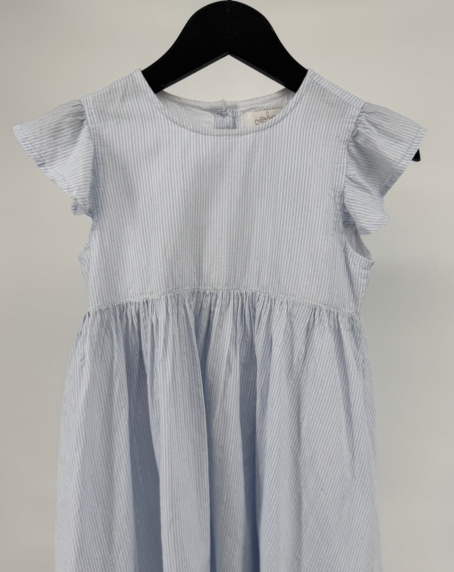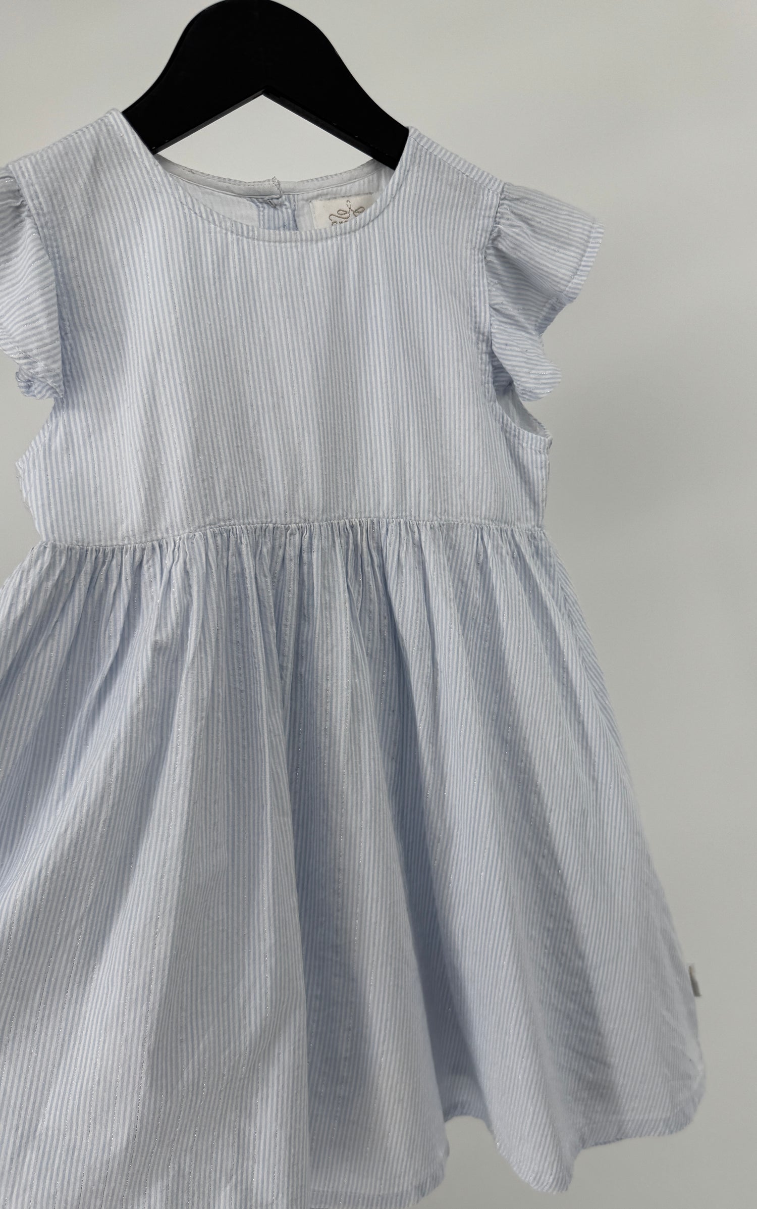 Lichtblauw met wit gestreept jurkje van Creamie in maat 110. Met een klein zilver lurex accent voor een feestelijk effect, zie foto’s. Roesjes langs de schouders, knoopjes op de rug. Het jurkje is volledig gevoerd met effen witte stof, zie foto’s.