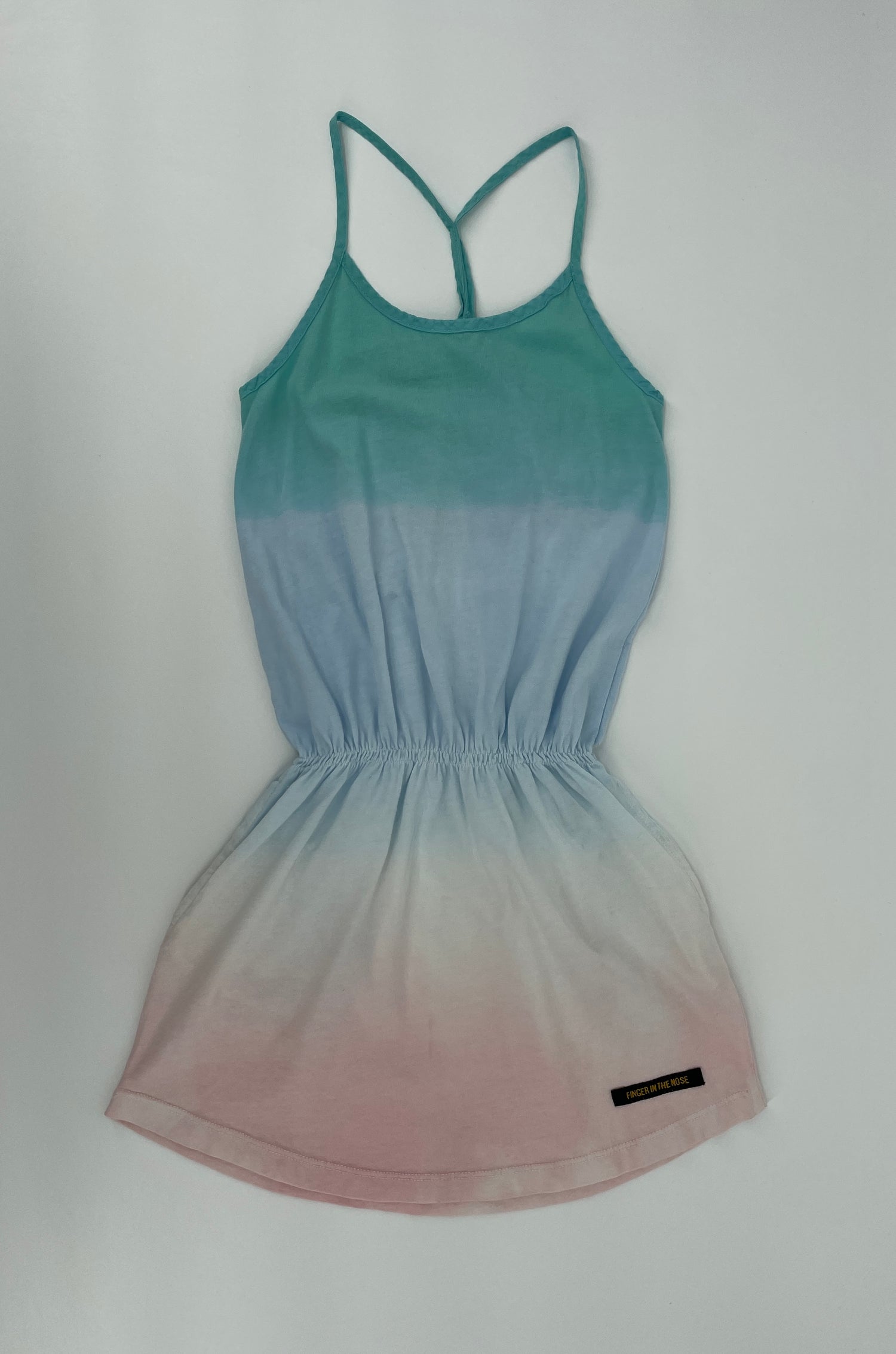 Multi color mouwloos zomerjurkje met dip dye effect van Finger in the Nose. Het jurkje loopt van zeegroen over in blauw en roze, zie foto’s. Hij heeft een getailleerde taille, twee zakken en dunne halter schouderbandjes, zie foto’s.