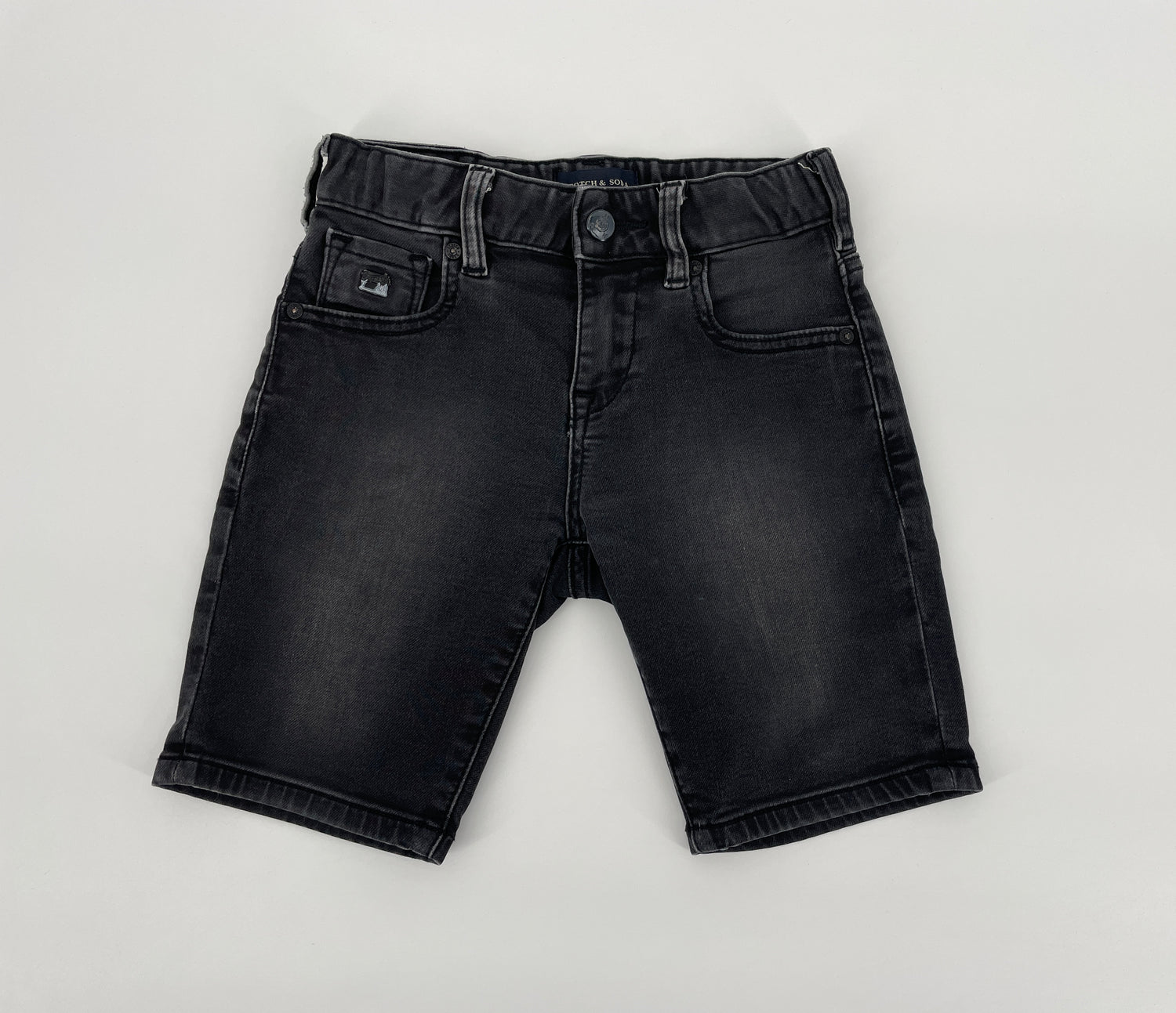 Donkergrijze denim korte broek van Scotch Shrunk in maat 128. Hij sluit voor met een rits en drukker en is binnenin met elastiek en knopen verstelbaar. Model: Strummer.