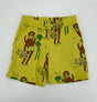 Gele korte broek van Mini Rodini met apenprint in maat 140 / 146. Met elastische tailleband met koordje om verder op maat te strikken en voorop twee zakken.