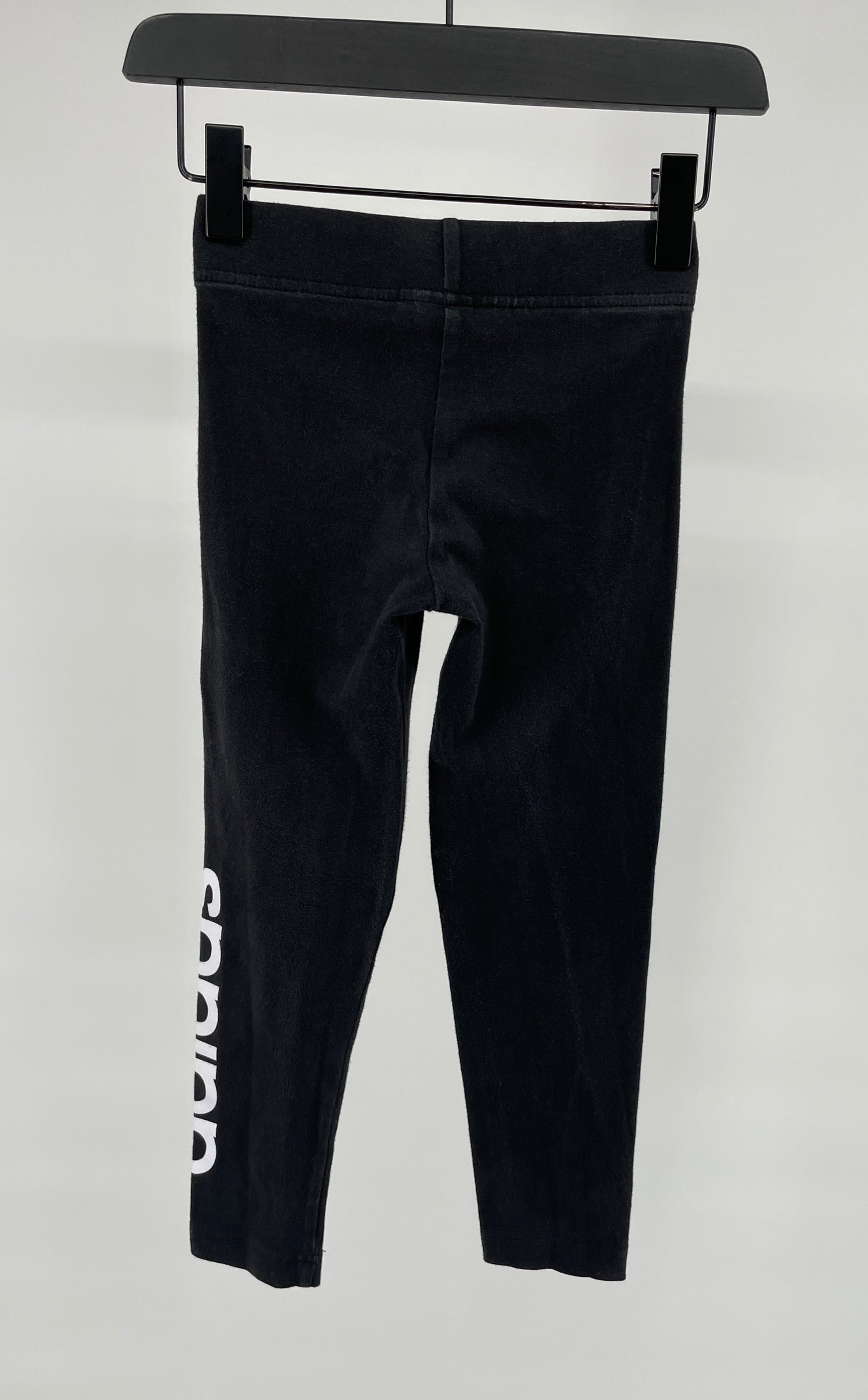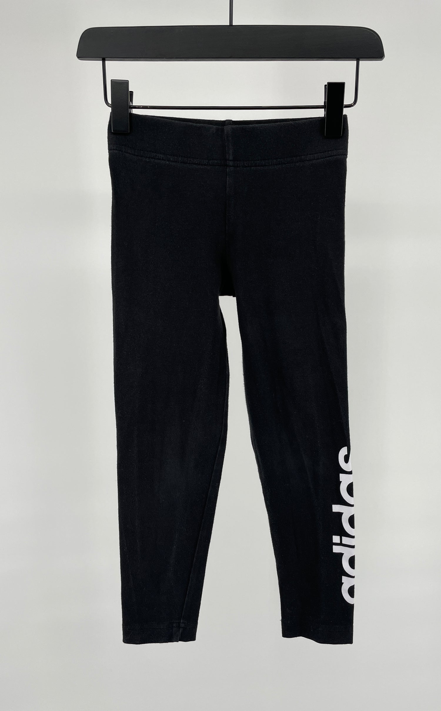 Zwarte sport legging van Adidas in maat 116. Met elastische tailleband en witte logo print op het linkerbeen aan de zijkant, zie foto’s.