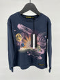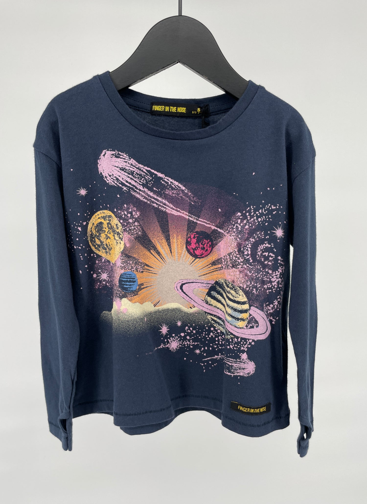 Donkerblauwe longsleeve van Finger in the Nose met voorop een grote print van planeten. In de boorden zit een duimopening, zie foto’s. Het shirt heeft een losse pasvorm.
