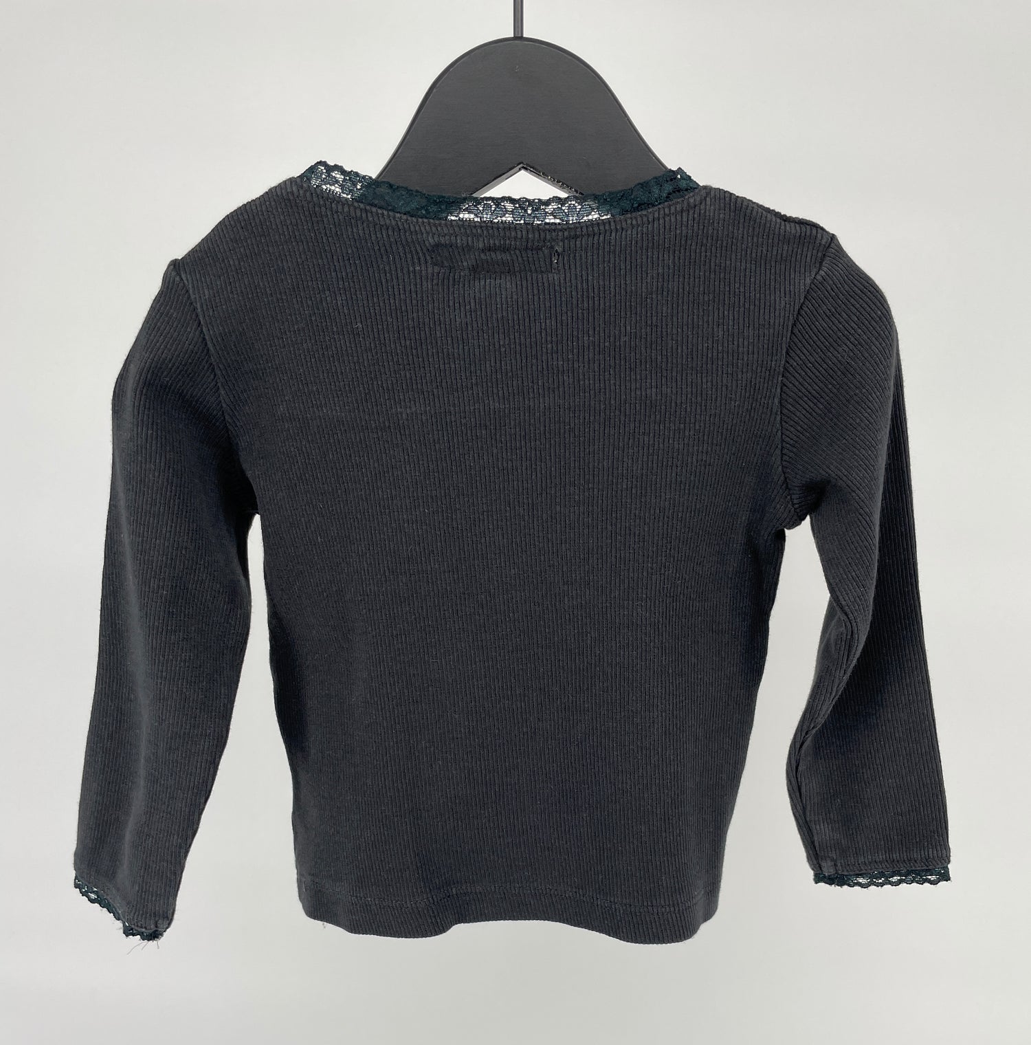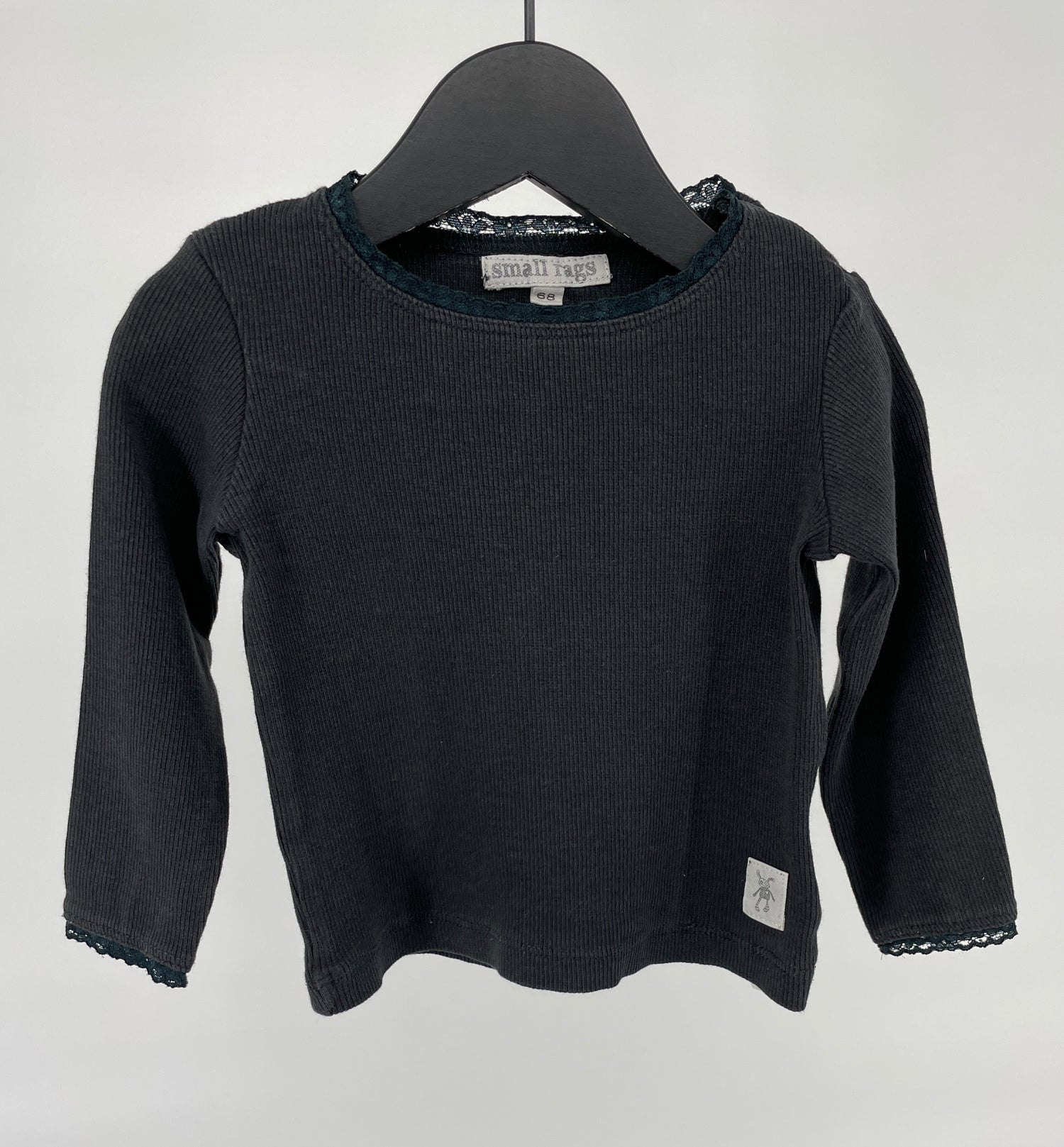 Zwarte longsleeve van Small Rags in maat 68. Hij is uitgevoerd in een vaal zwarte rib katoen en heeft drukkers op de schouder voor makkelijk aan- en uitkleden. De hals en mouw uiteindes zijn afgezet met een zwart kant randje, zie foto’s.