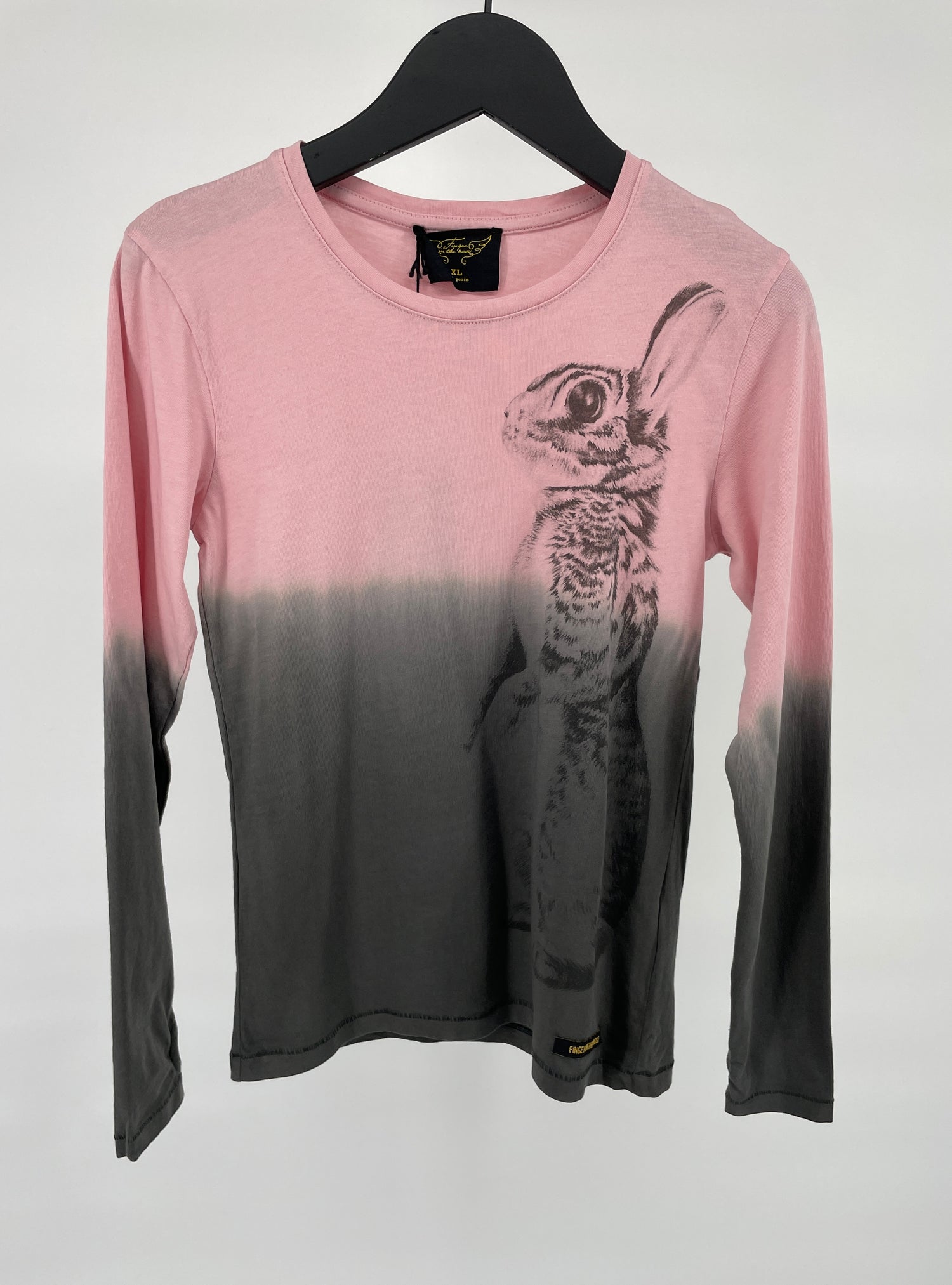Roze met grijze longsleeve van Finger in the Nose in maat 134. Hij loopt over van roze aan de bovenkant, naar grijs aan de onderkant, zie foto’s. Voorop is een grote print van een konijn opgenomen en in de boorden zit een duimopening, zie foto’s.