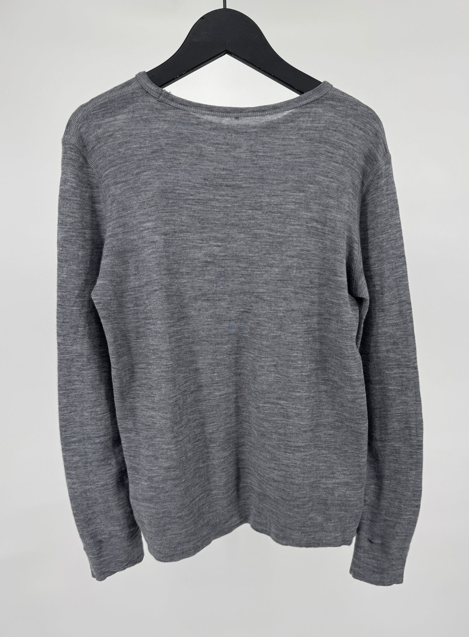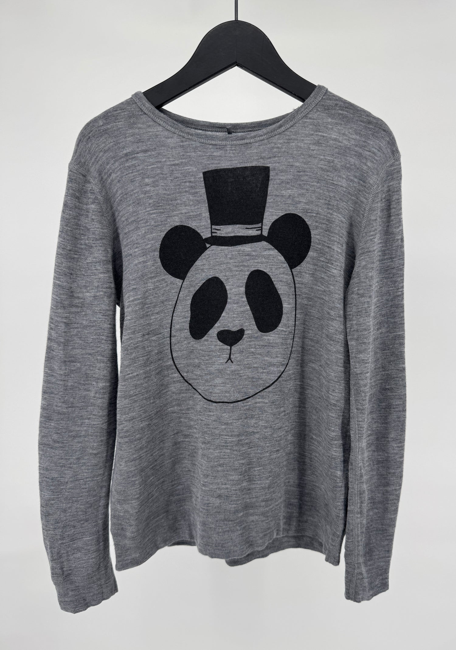 Grijze wollen longsleeve van Mini Rodini met voorop in zwart een grote panda print, ronde hals en boorden bij mouwen en aan de onderzijde.