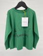 Groene longsleeve van The Campamento in maat 104. Hij heeft voorop een print van verschillende groente figuren en de tekst ‘El Ultramarinos by TC’, zie foto’s.