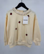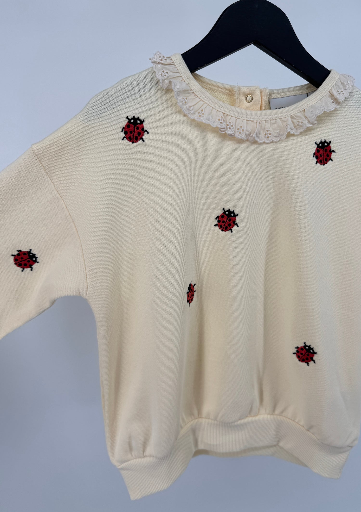 Beige trui met roesjeskraag en geborduurde lieveheersbeestjes in maat 116 / 122. Met drie drukkers op de rug.