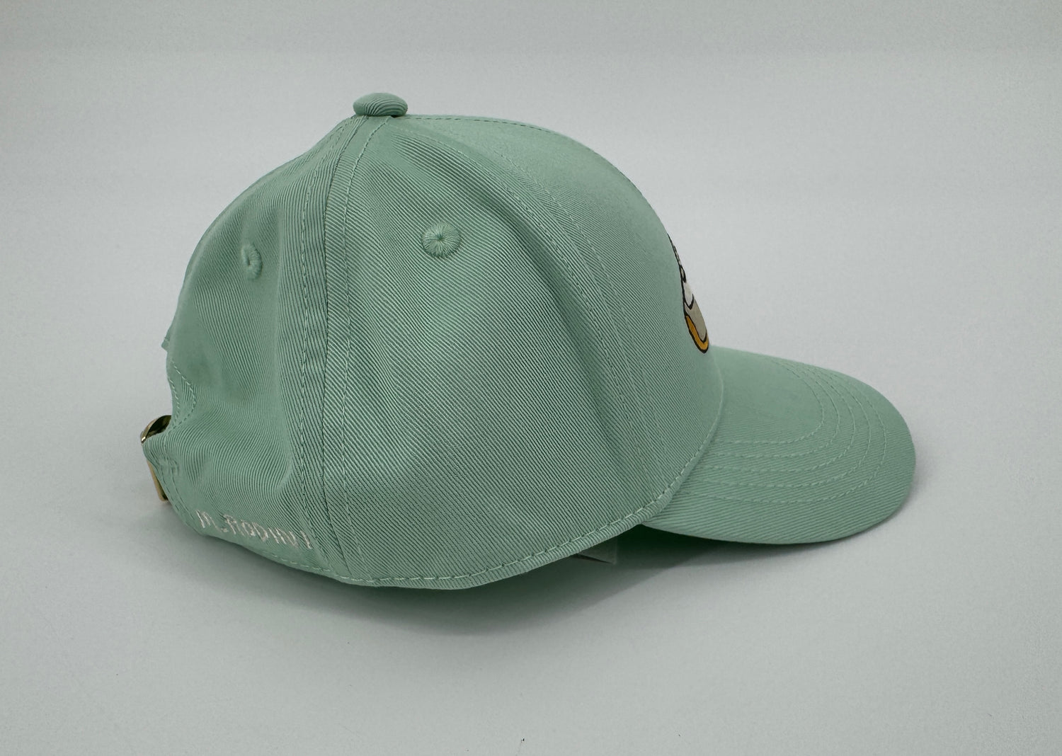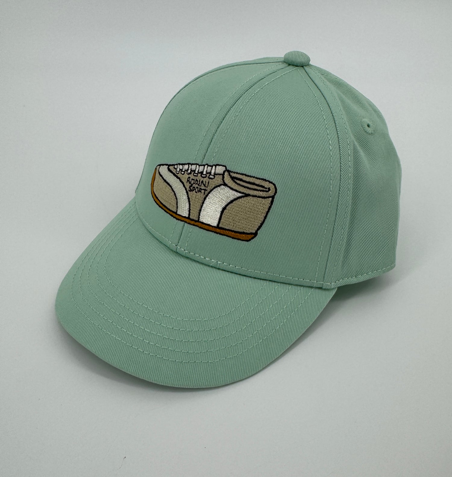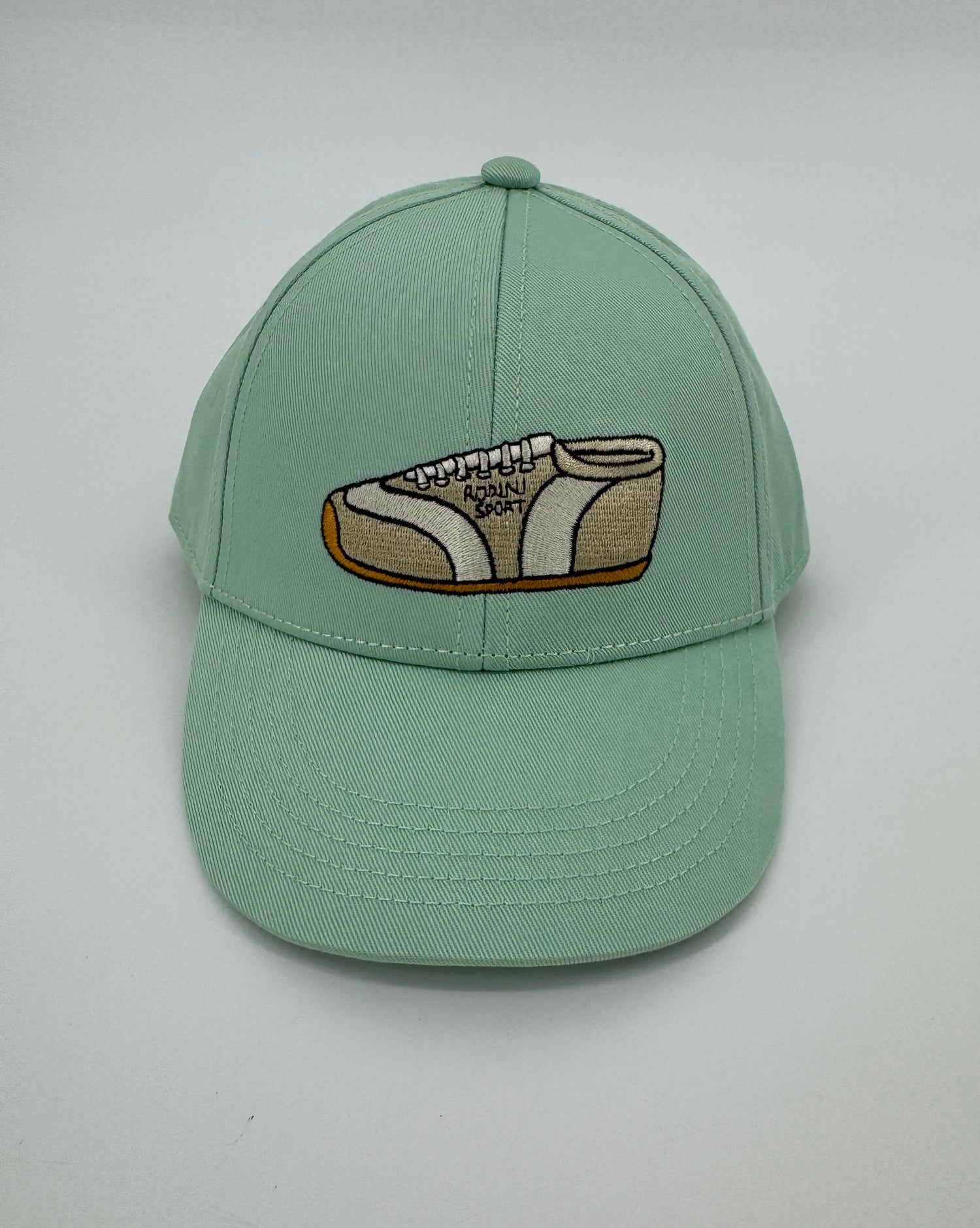Mintgroene pet van Mini Rodini met geborduurde sneaker voorop. Je kunt de pet aan de achterkant op maat stellen. Langs de zijkant staat in witte letters geborduurd ‘M. Rodini’.