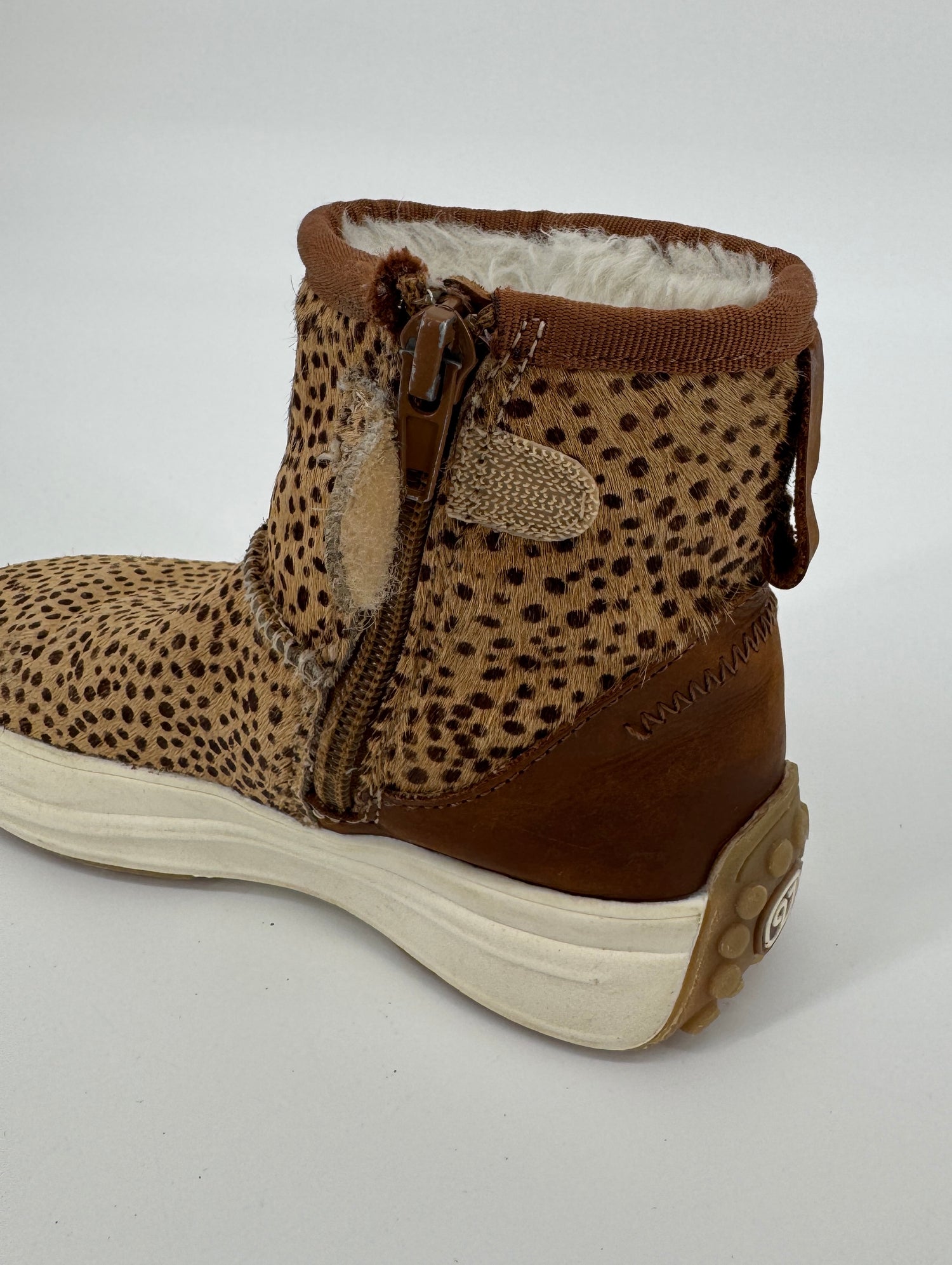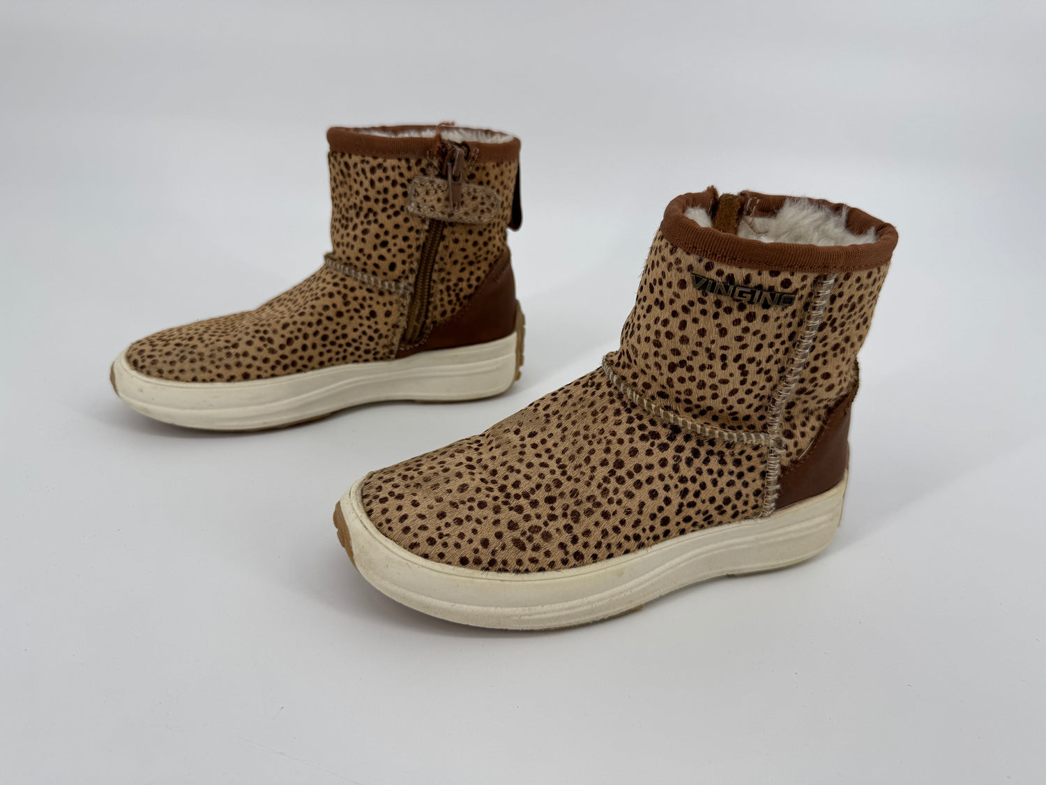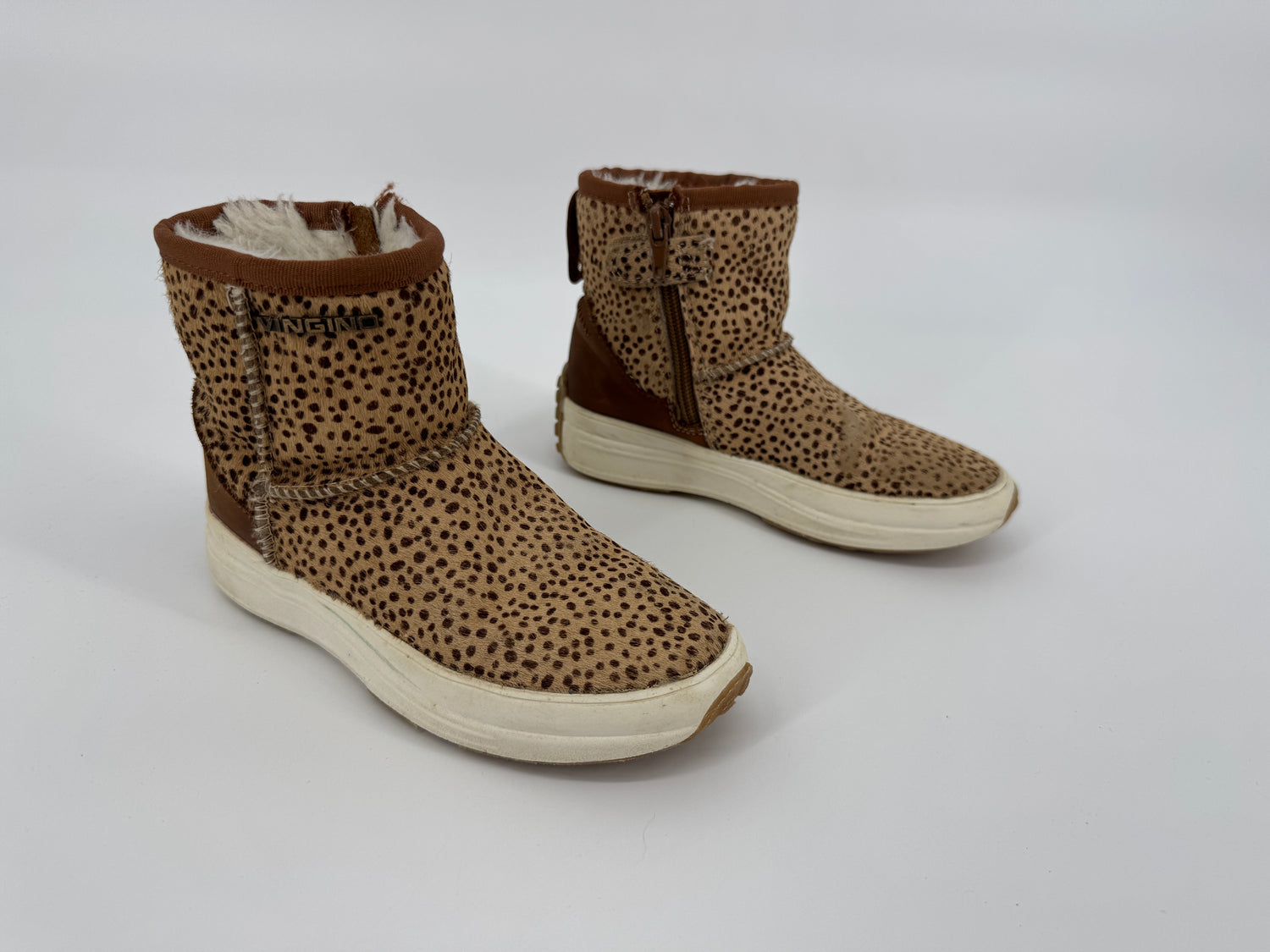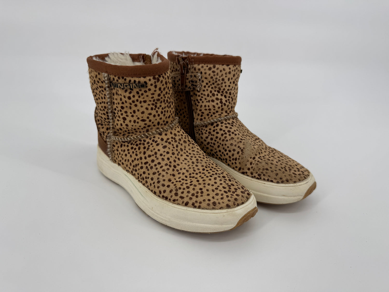 Bruine enkellaarsjes van Vingino in maat 30. Ze zijn uitgevoerd in ponyhaar met stippenprint, gevoerd met beige faux fur en hebben een bruin leren hiel, zie foto’s. Je trekt de laarsjes makkelijk aan- en uit met de lus aan de achterkant en ritsen aan de binnenzijde, zie foto’s.