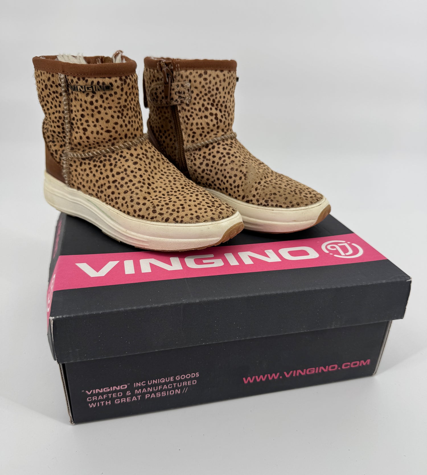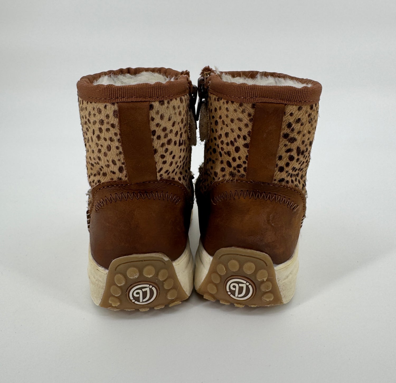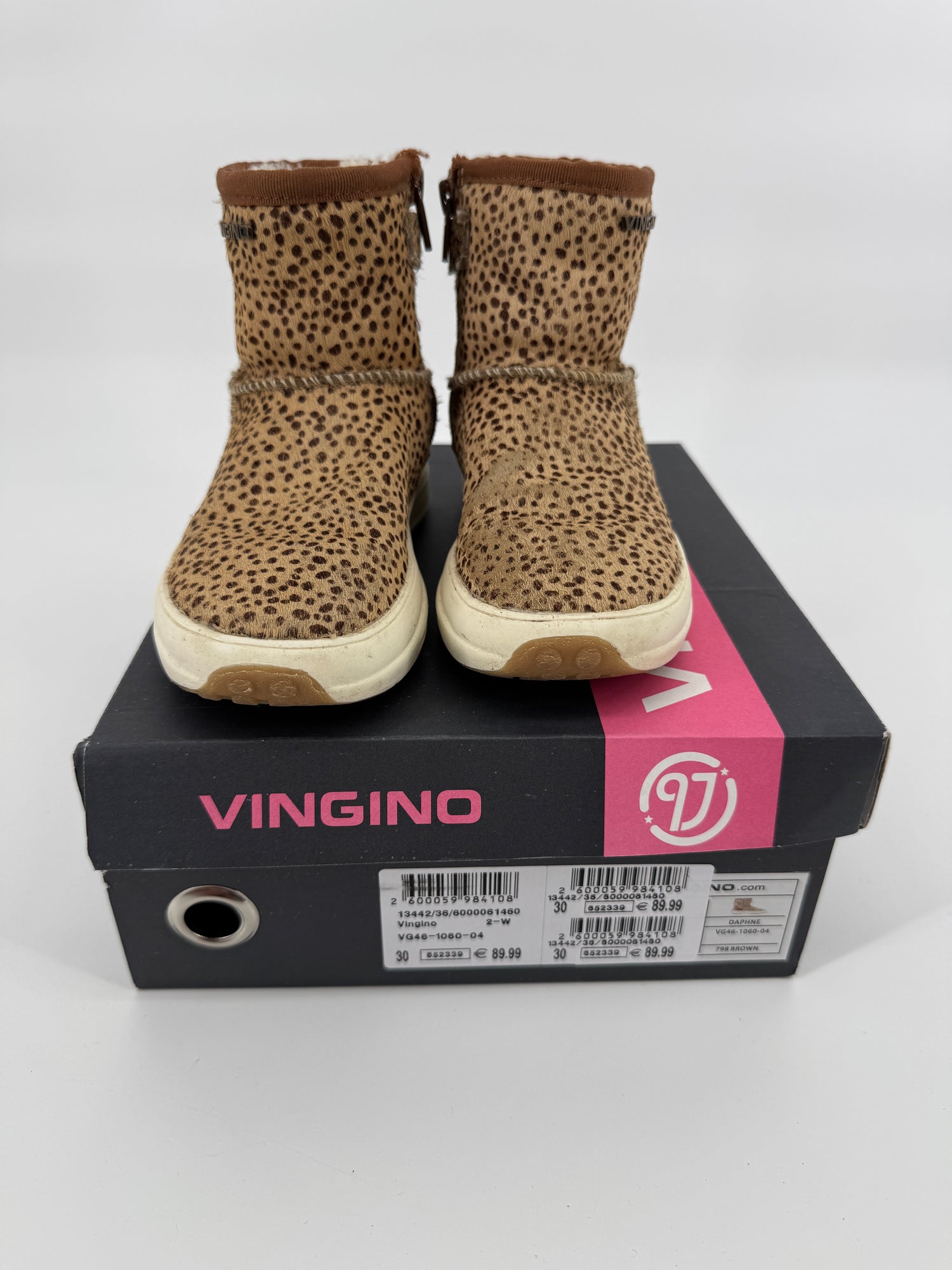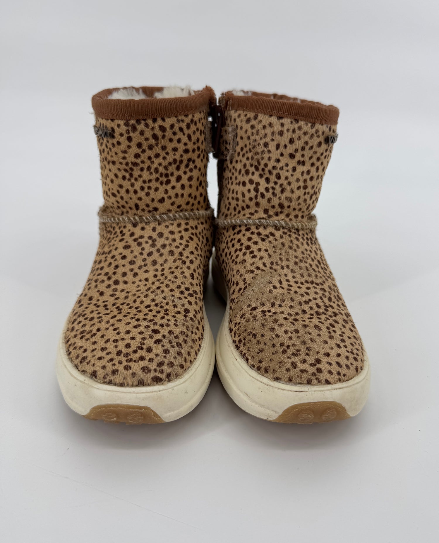 Bruine enkellaarsjes van Vingino in maat 30. Ze zijn uitgevoerd in ponyhaar met stippenprint, gevoerd met beige faux fur en hebben een bruin leren hiel, zie foto’s. Je trekt de laarsjes makkelijk aan- en uit met de lus aan de achterkant en ritsen aan de binnenzijde, zie foto’s.