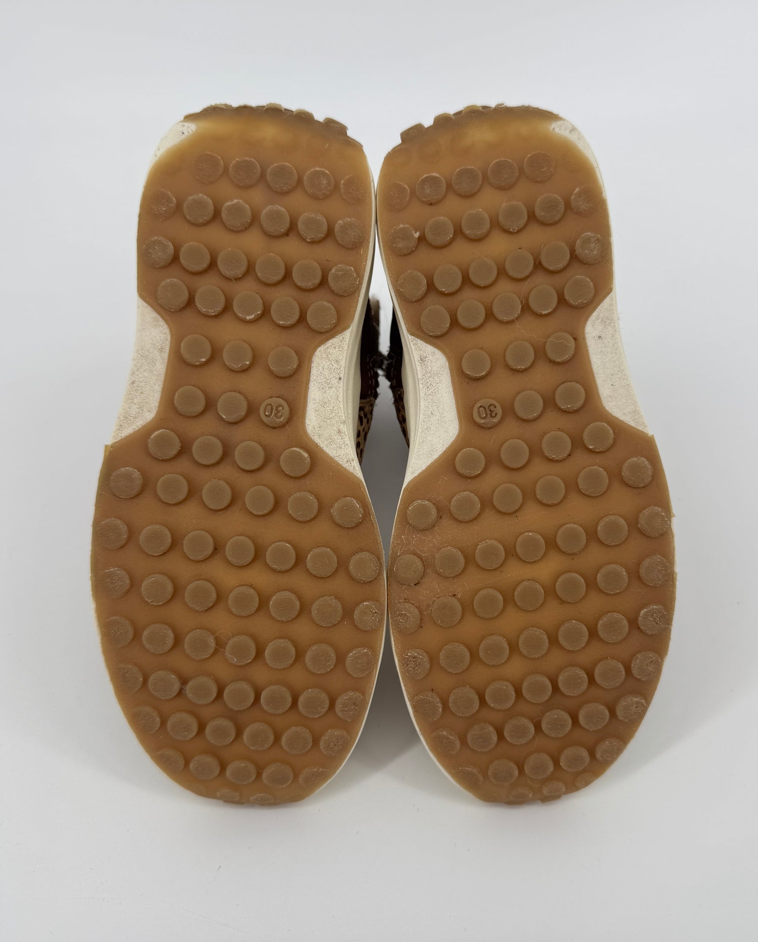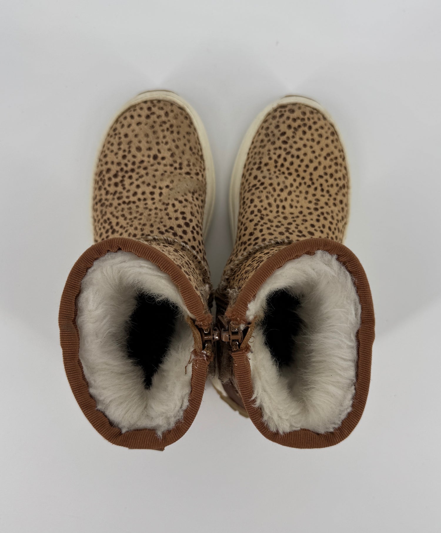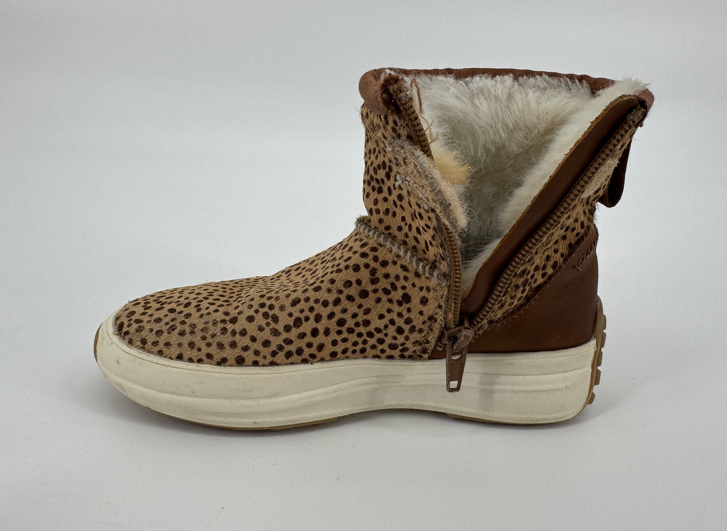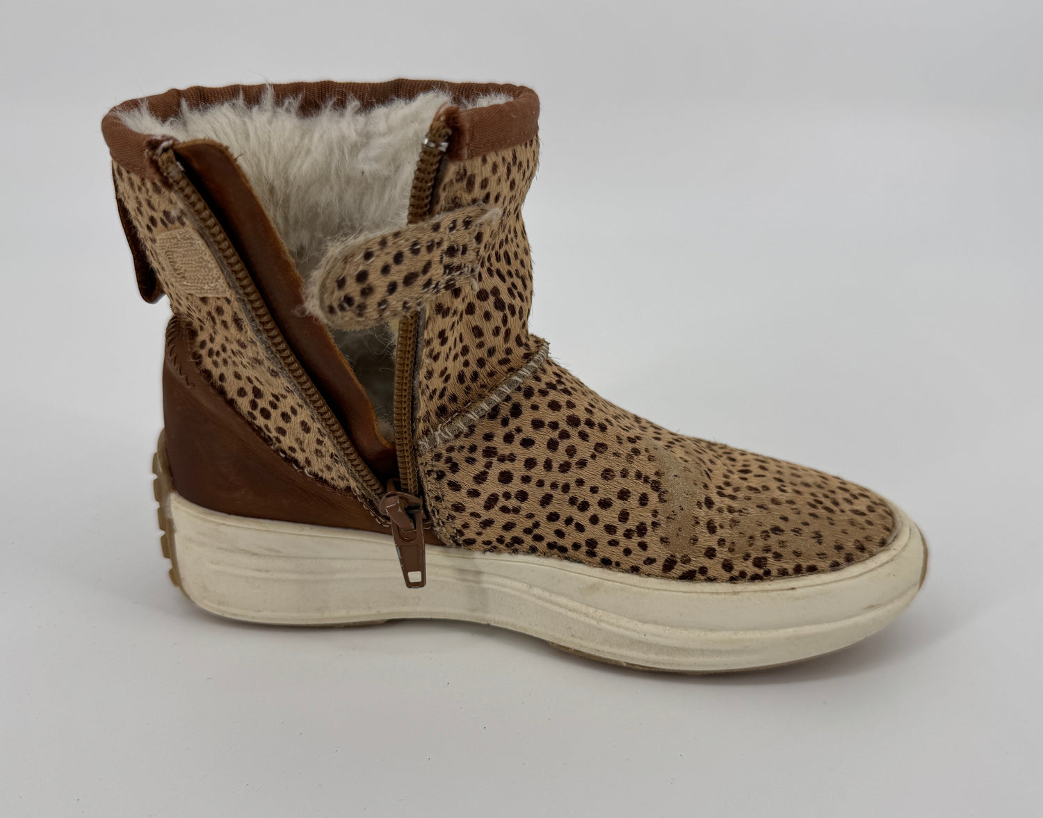 Bruine enkellaarsjes van Vingino in maat 30. Ze zijn uitgevoerd in ponyhaar met stippenprint, gevoerd met beige faux fur en hebben een bruin leren hiel, zie foto’s. Je trekt de laarsjes makkelijk aan- en uit met de lus aan de achterkant en ritsen aan de binnenzijde, zie foto’s.