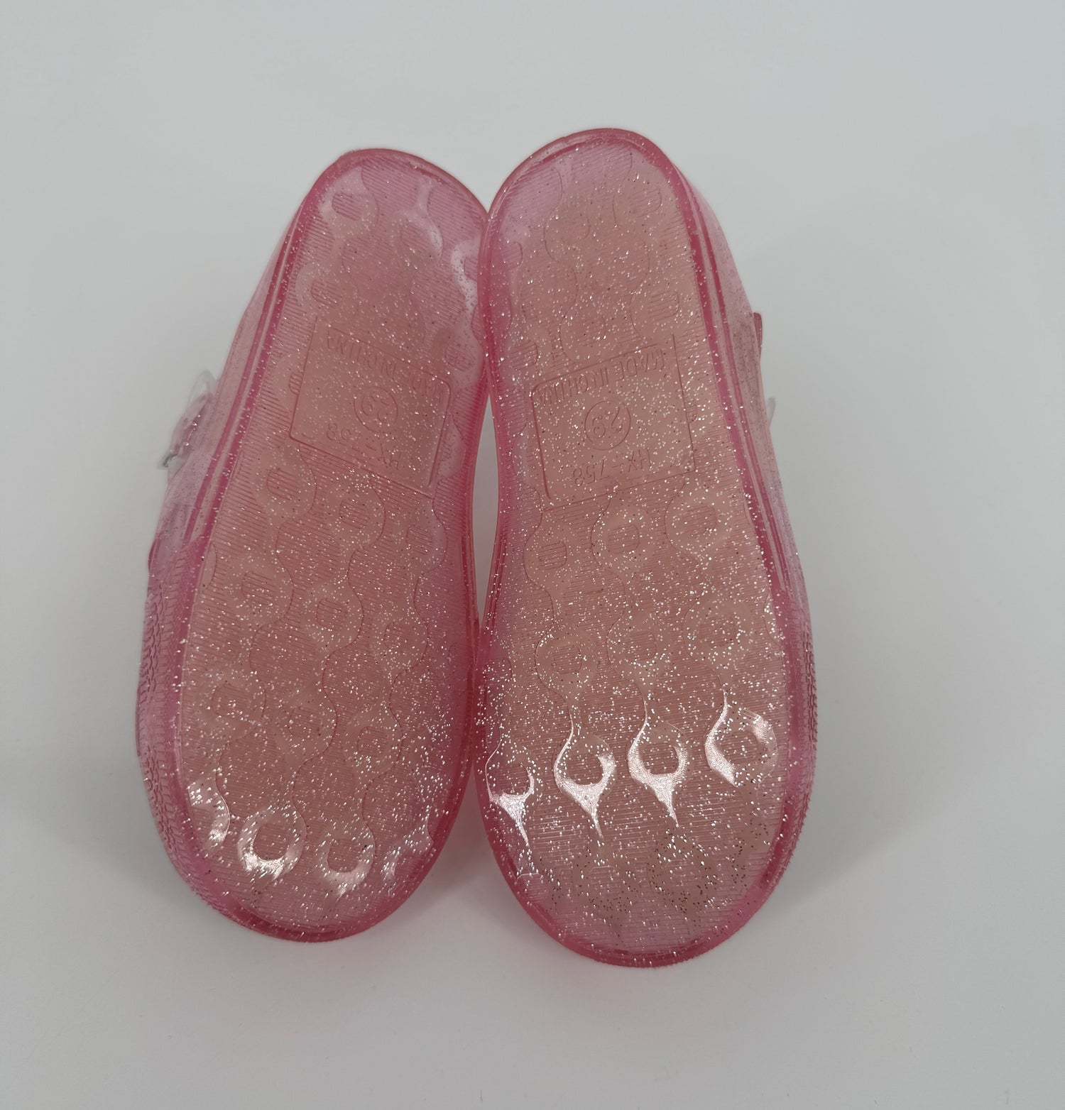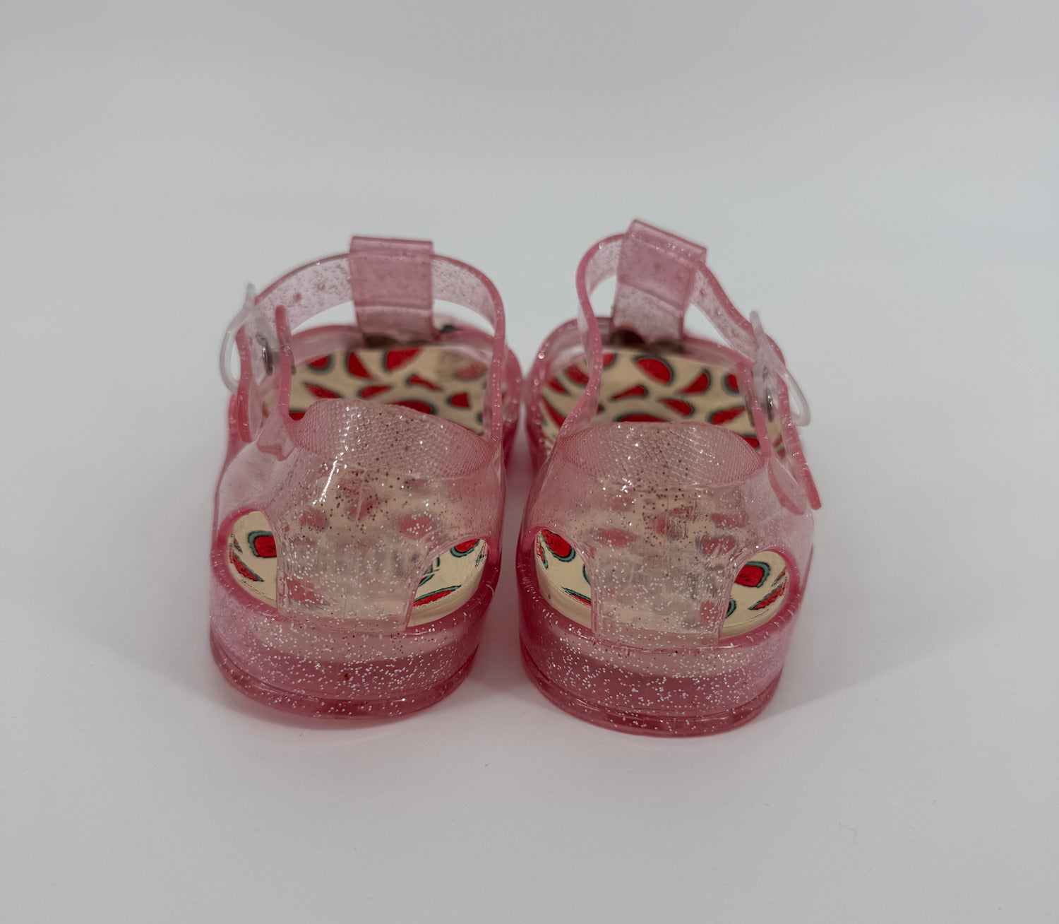 Doorzichtig roze met glitter waterschoenen van Disney in maat 29. Ze sluiten met een riempje en hebben voorop een Minnie Mouse, zie foto’s. Beige binnenzool met anti slip en print van watermeloenen, zie foto’s.