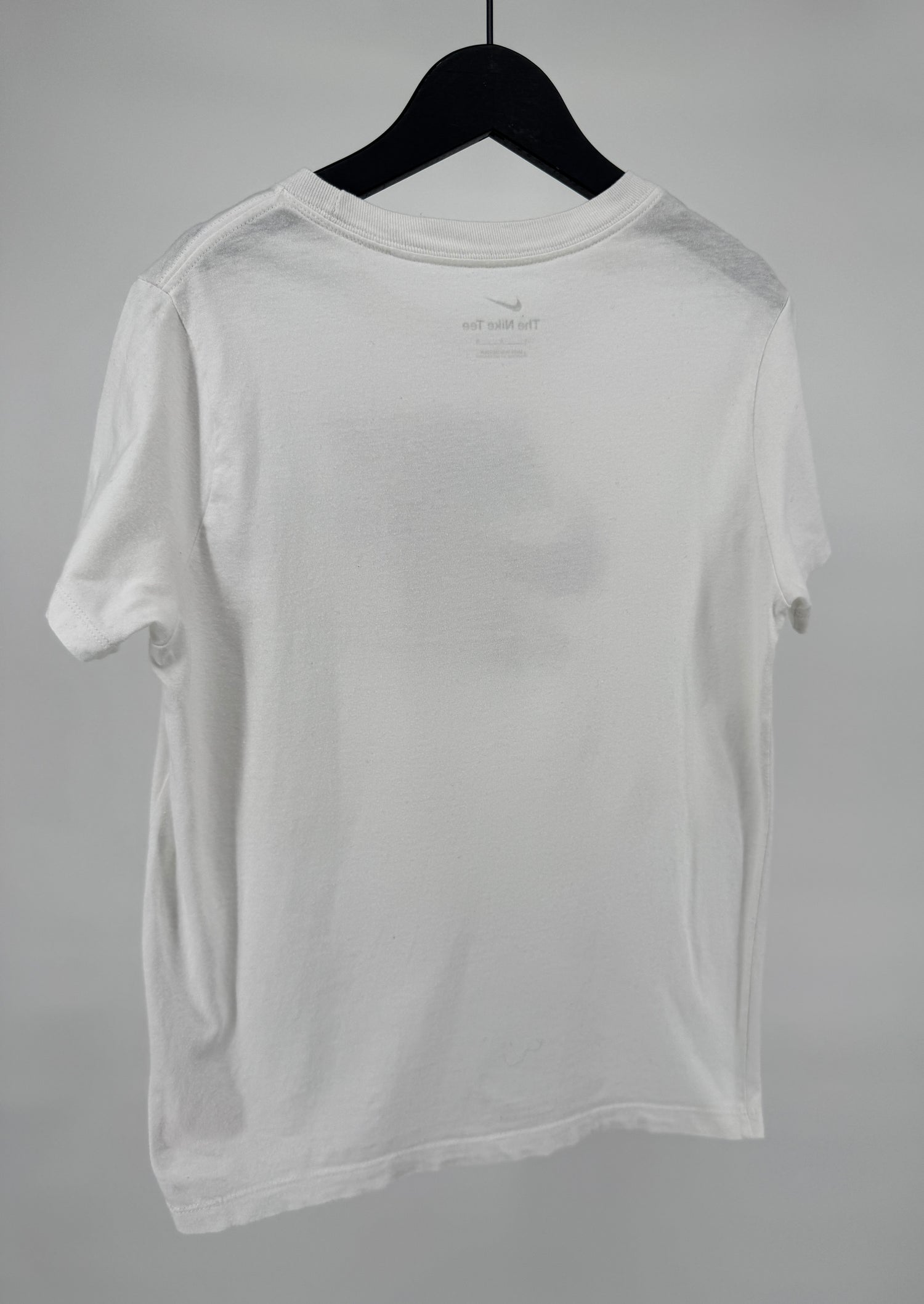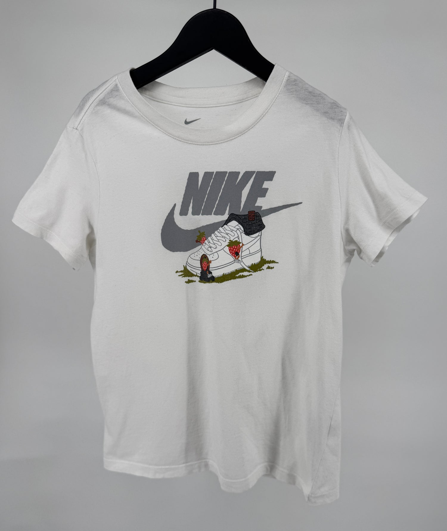 Wit t-shirt met print van een sneaker met aardbeien van Nike in maat 152 / 158. Grijze logo print en sneaker huisje met aardbeien, zie foto’s.