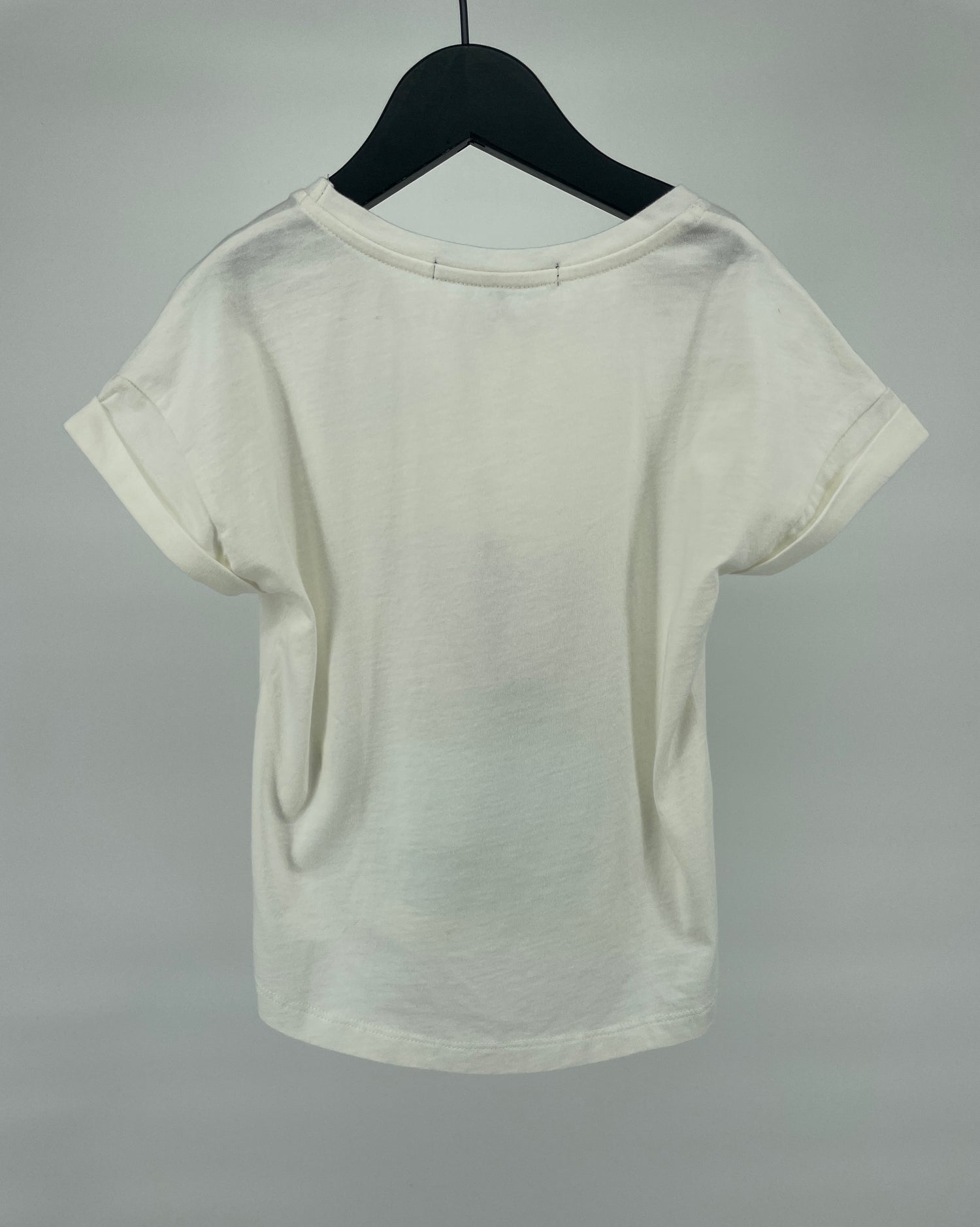Beige t-shirt met surf print van Finger in the Nose in maat 110. Hij heeft omgestikte mouwtjes en voorop staat in 3 afbeeldingen onder elkaar een surf girl, zie foto’s.