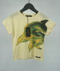 Geel t-shirt met dolfijnen print van Finger in the Nose in maat 122. Hij heeft omgestikte mouwtjes en voorop staat in geel- en groentinten een grote print met dolfijnen, zie foto’s.