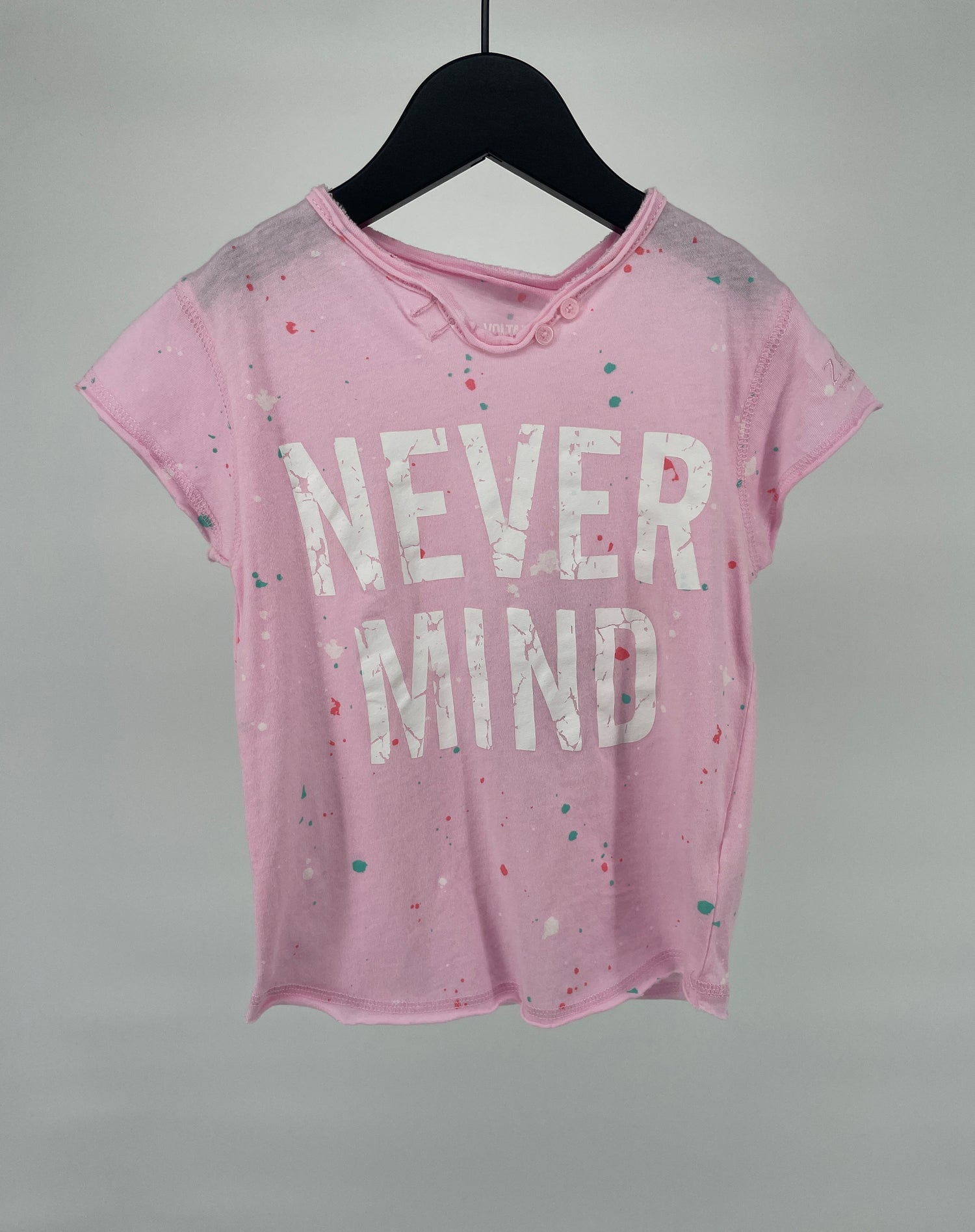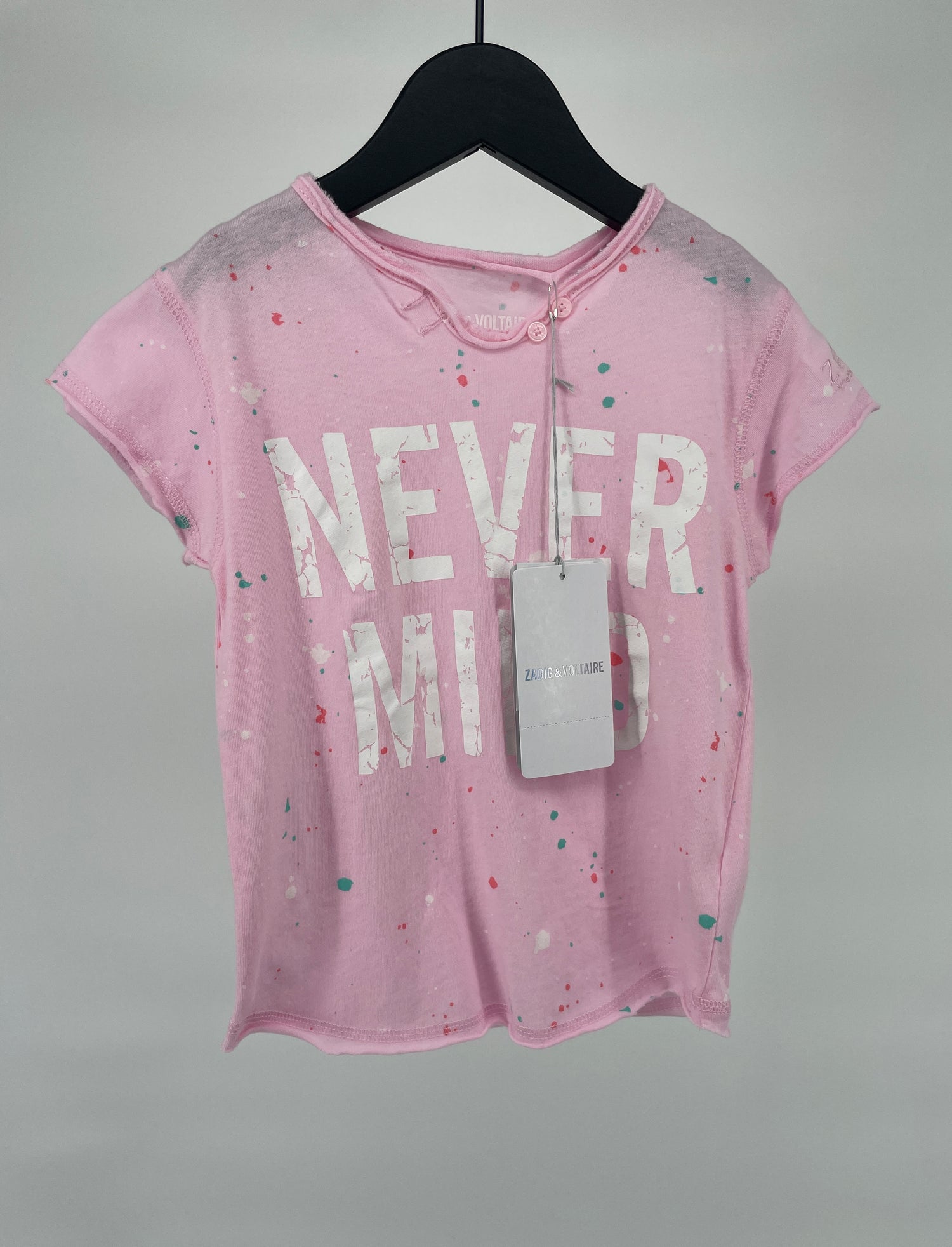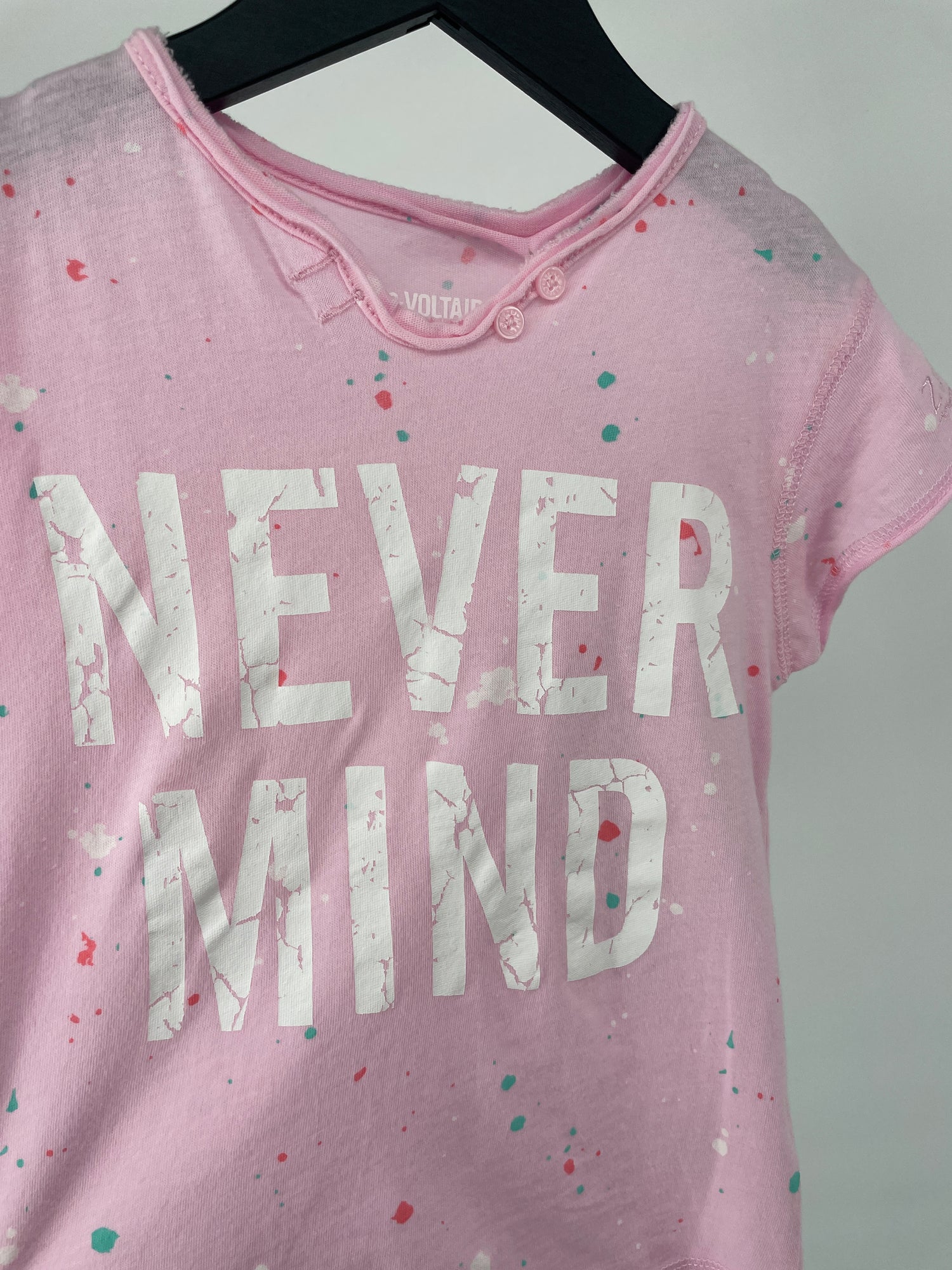 Lichtroze t-shirt van Zadig et Voltaire in maat 104. Het shirt heeft v-hals, all over spetter print en voorop in witte letters de tekst ‘NEVER MIND’. De naden zijn speels afgewerkt en op de linkermouw is het logo geborduurd, zie foto’s.