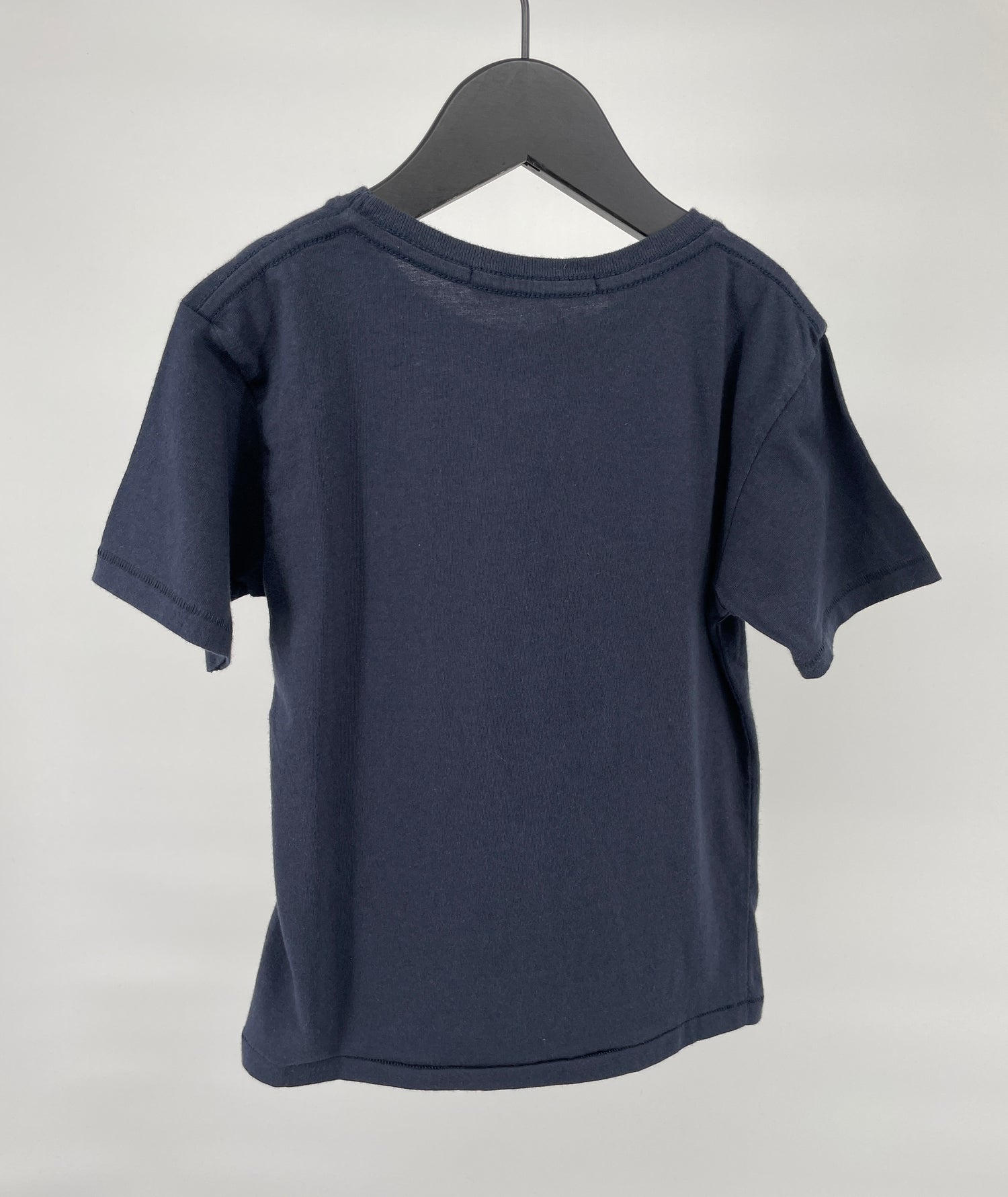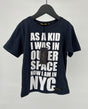 Donkerblauw t-shirt met witte tekst van Finger in the Nose in maat 110. Voorop staat in witte letters de tekst ‘As a kid I was in Outer space now I am in NYC’, zie foto's.