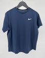 Donkerblauw tennis shirt van Nike in maat 152 / 158. Met Dri-fit technologie, een kleine V-hals en witte swoosh op de borst.