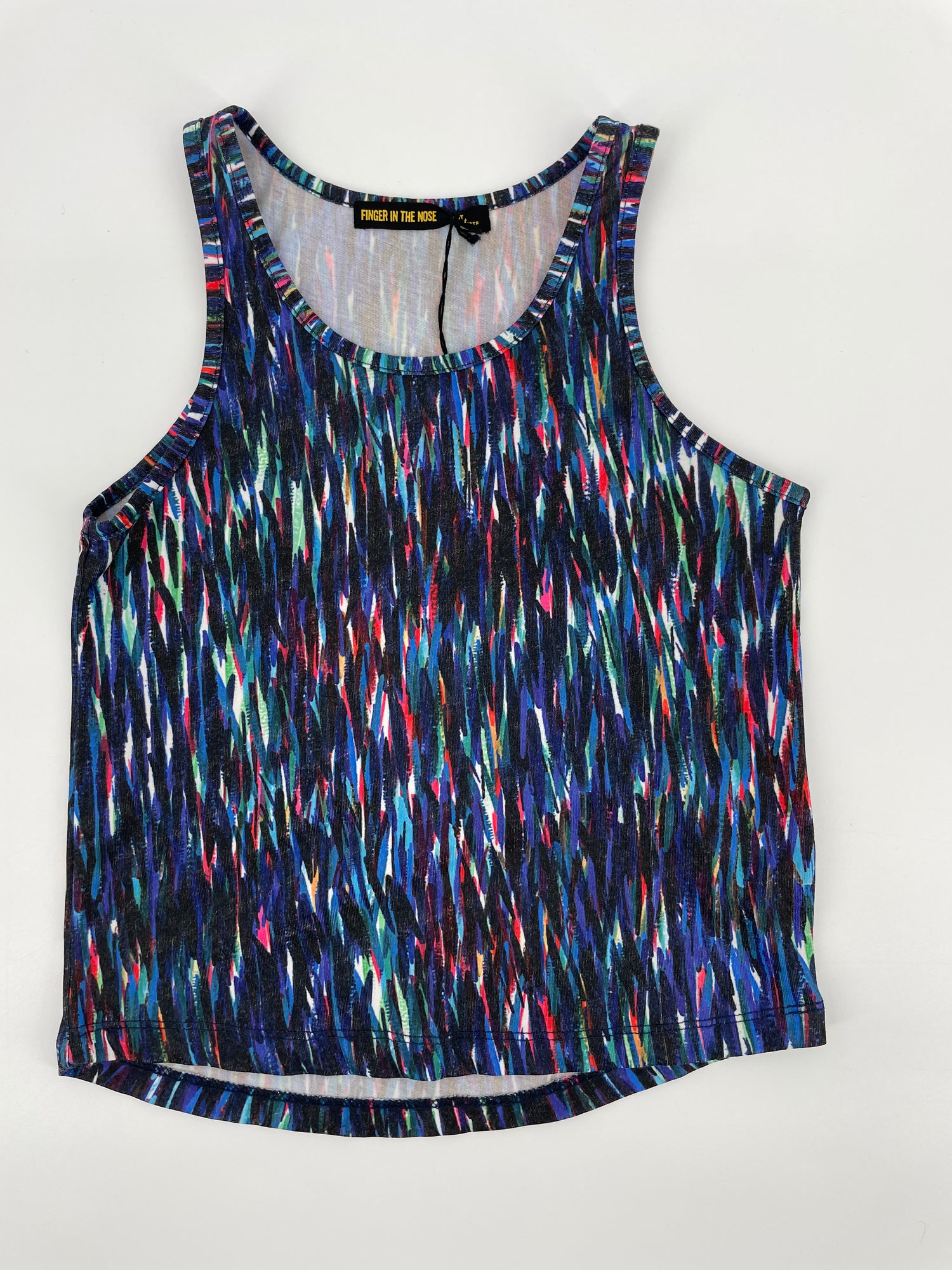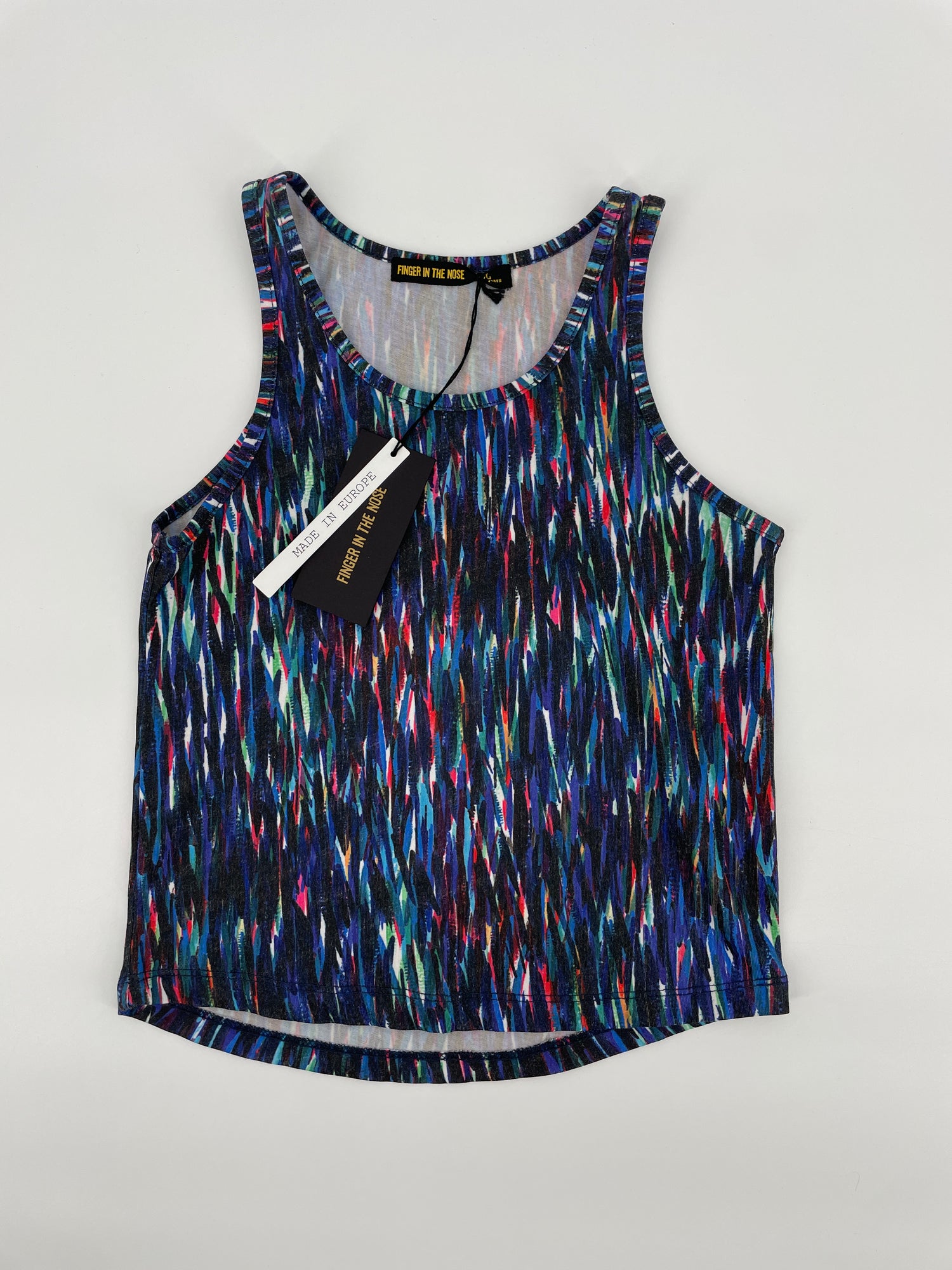 Multicolor tanktop van Finger in the Nose in maat 122 met all over print van diverse kleuren ‘regen’, zie foto’s. De top heeft een iets langere achterkant, zie foto’s. D