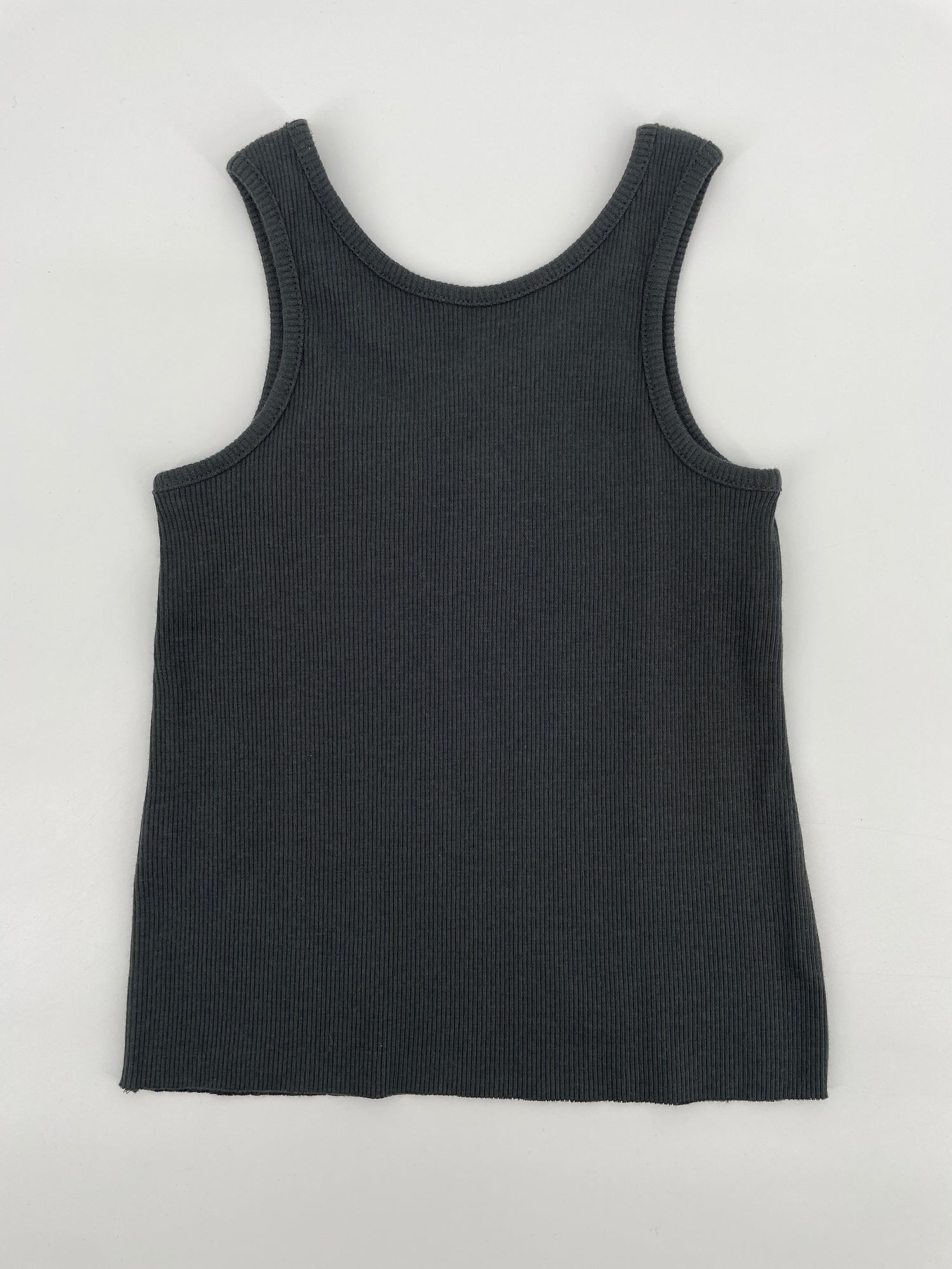 Zwarte basic tanktop van Little Hedonist in maat 86 / 92. Uitgevoerd in ribstof, met geborduurde ‘H’ op de borst en de typische onafgewerkte onderkant. Kleurinformatie: Pirate Black.