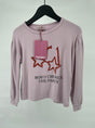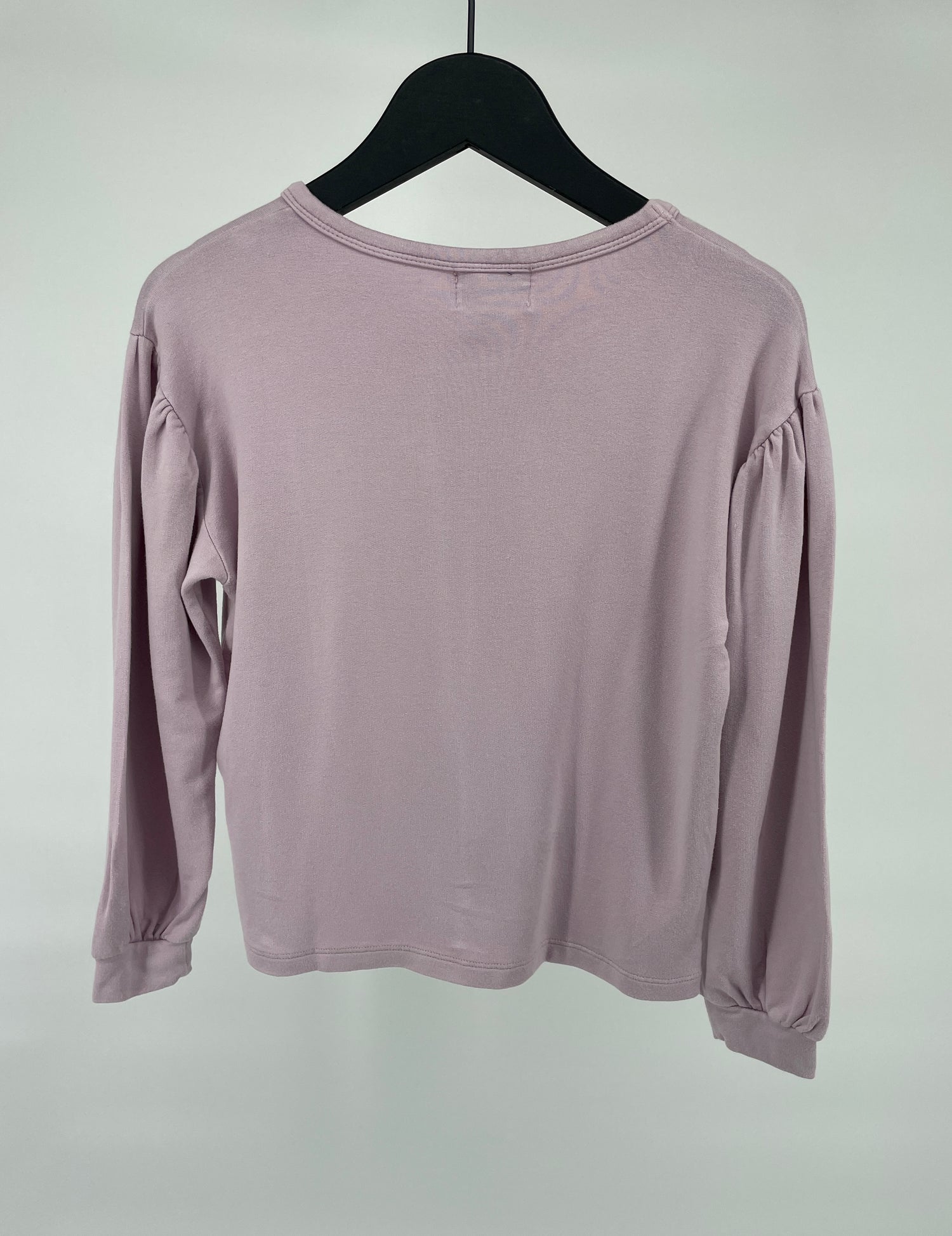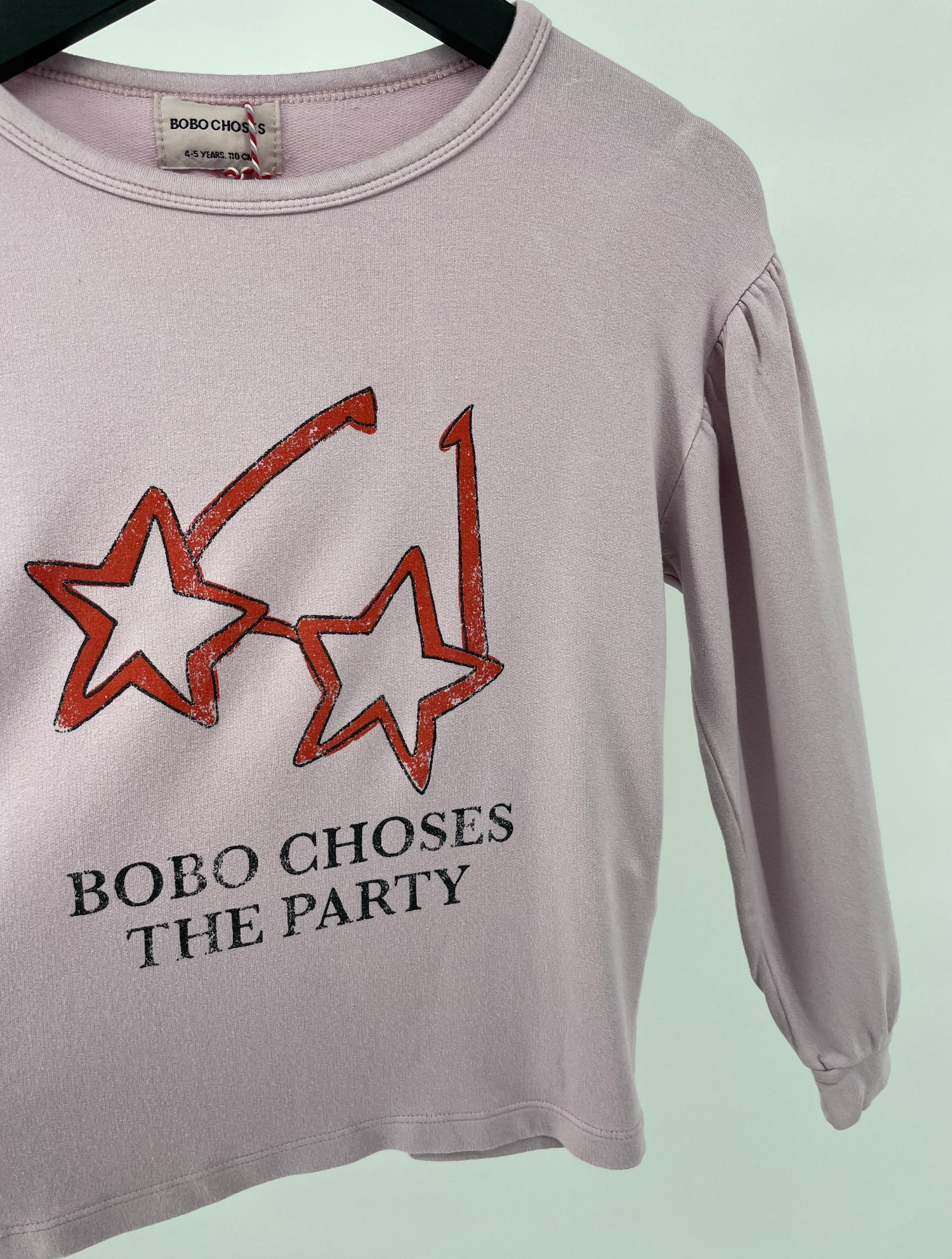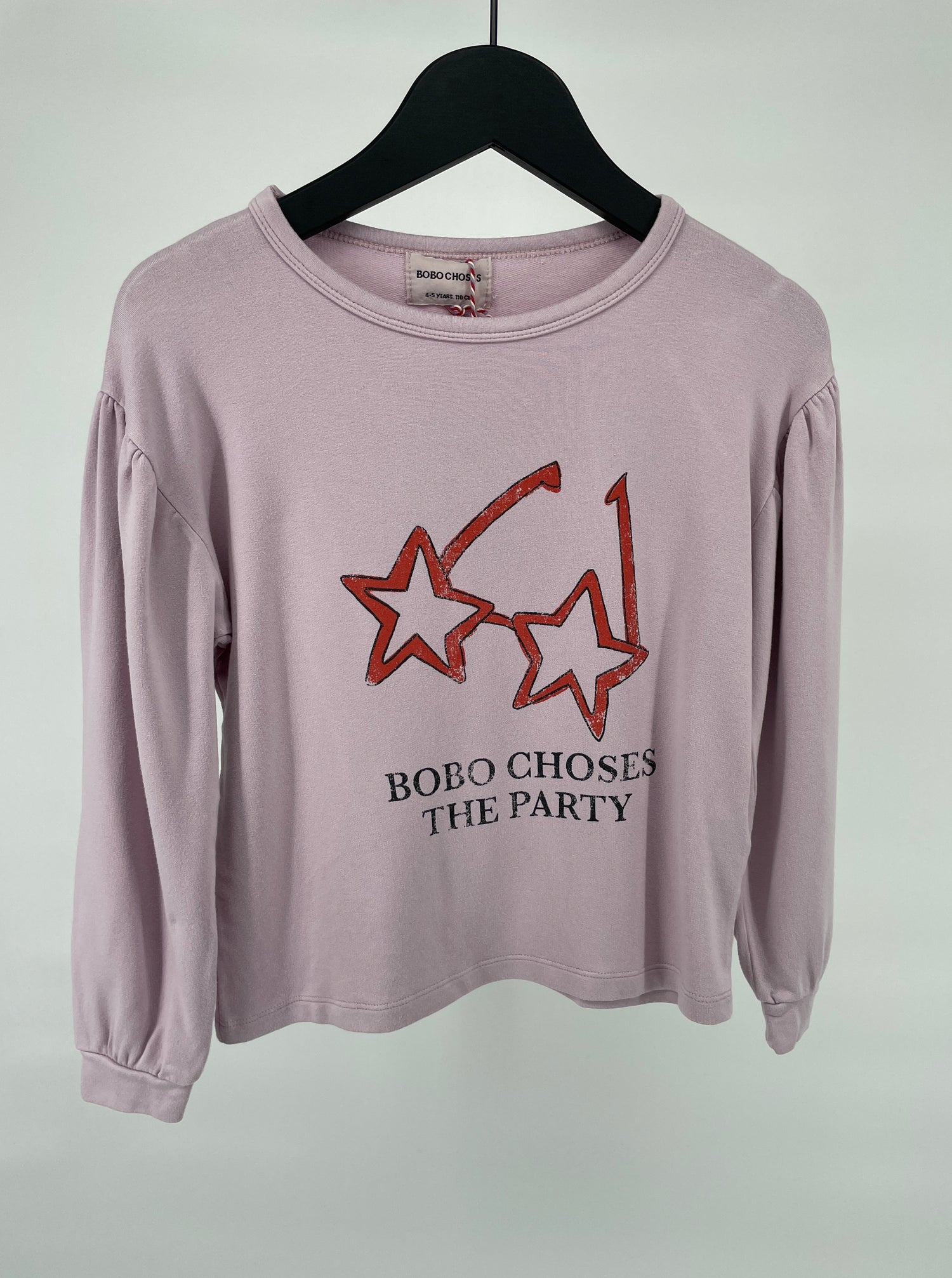 Lila paarse top met lange mouwen van Bobo Choses in maat 104 / 110. Voorop staat een print van een rode bril met sterren en daaronder de tekst ‘Bobo Choses The Party’, zie foto’s.