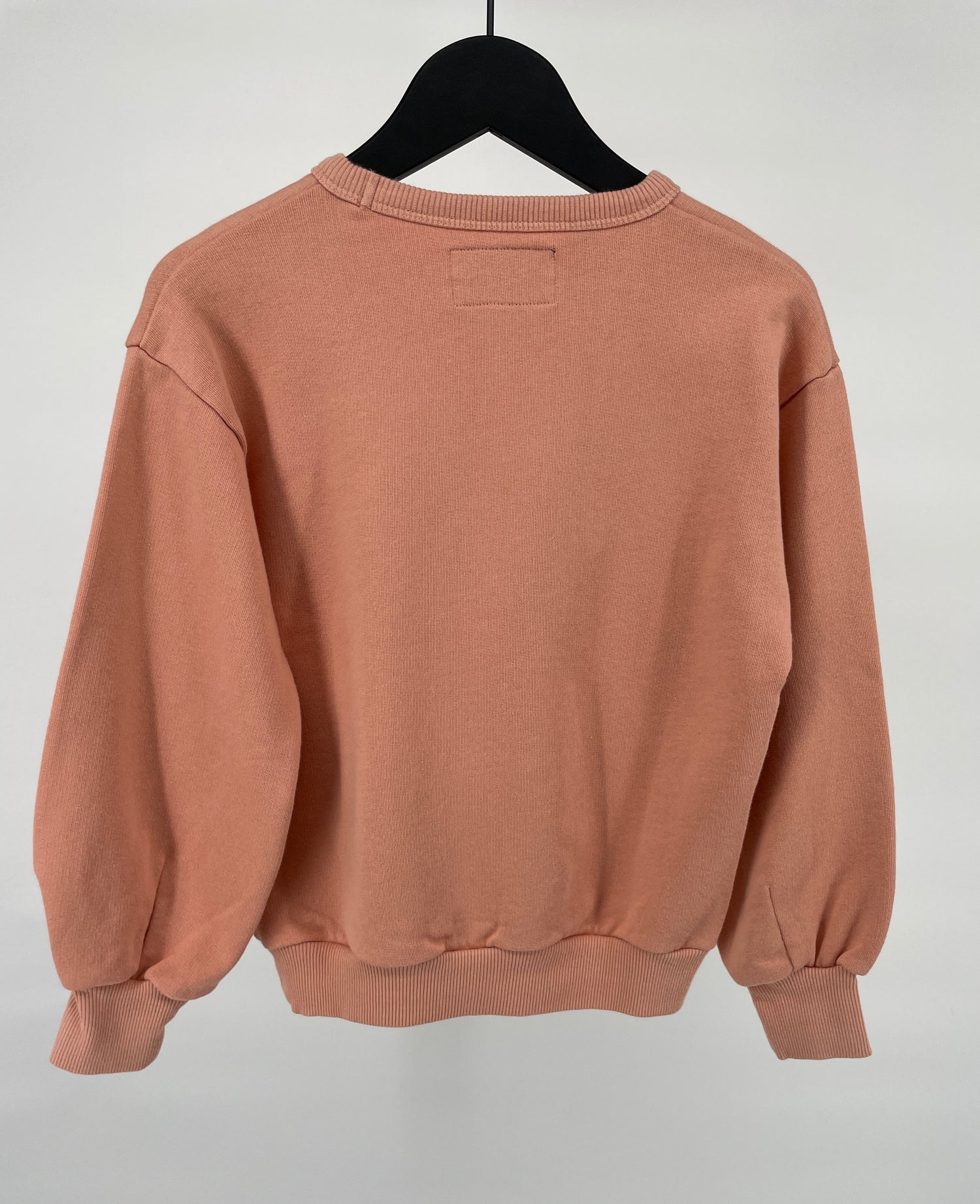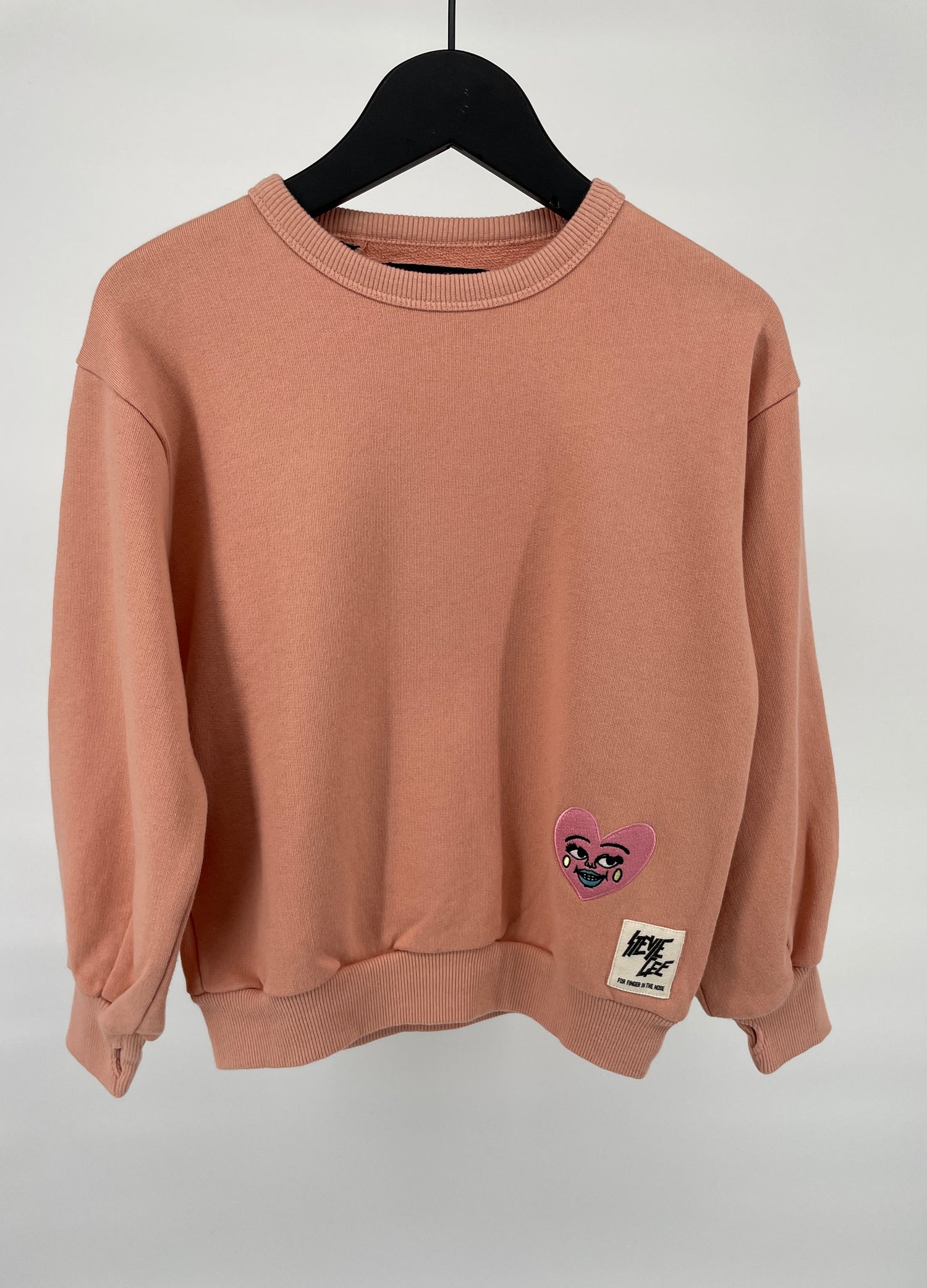Poeder roze trui van Finger in the Nose in maat 122. Linksonder vind je een borduurwerk van een roze hartje met gezichtje, zie foto’s. Het artwork is verzorgd door artiest en illustrator Stevie Gee. In de boorden zit een duimopening, zie foto's.