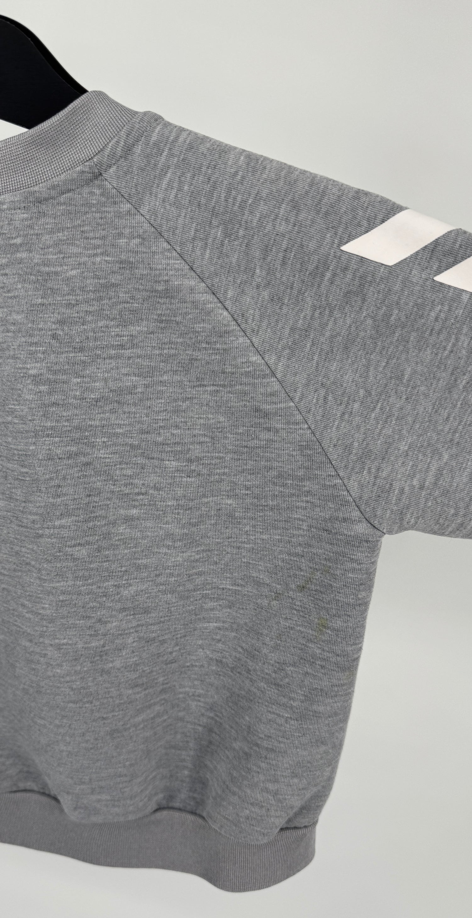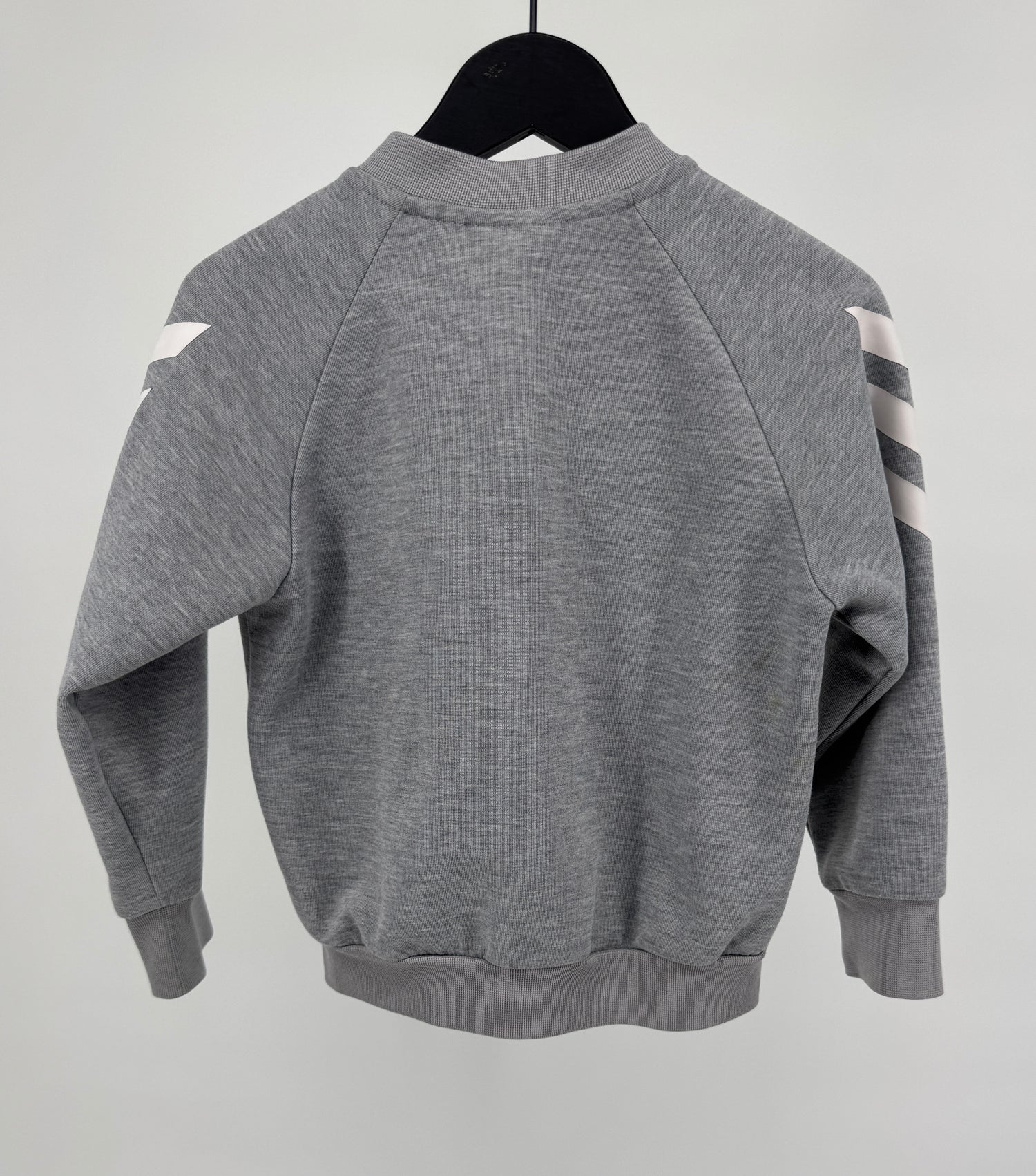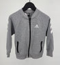 Grijs vest met witte accenten van Adidas in maat 116. Met ritssluiting voor, wit logo op de borst en twee zakken met rits. Witte strepen op de mouwen, zie foto’s.