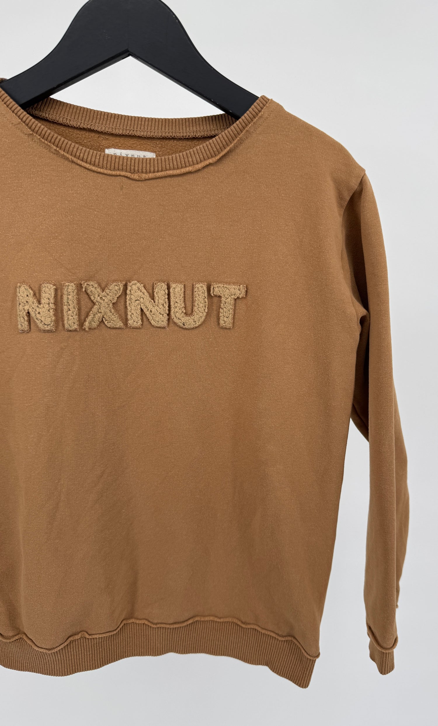 Bruine trui van Nixnut in maat 128. Met logo applicatie voorop en klein logo detail achterop. Rafelrandjes in de afwerking bij hals, mouwen en onderkant, zie foto’s.