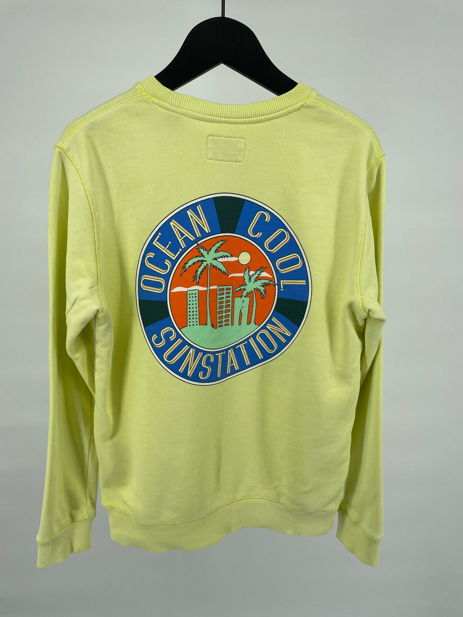 Gele trui van Scotch Shrunk in maat 140. Voorop staat een kleine print van ‘Ocean Cool Sun station’ en op de rug staat dezelfde print in het groot, zie foto’s.