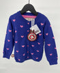 Paars vestje met roze hartjes van 4 Funky Flavours in maat 86 / 92. All over patroon van roze hartjes met zilveren accenten en kleine pikkels en bloemetjes knoopjes voorop. Effen roze stof afwerking aan de binnenkant.