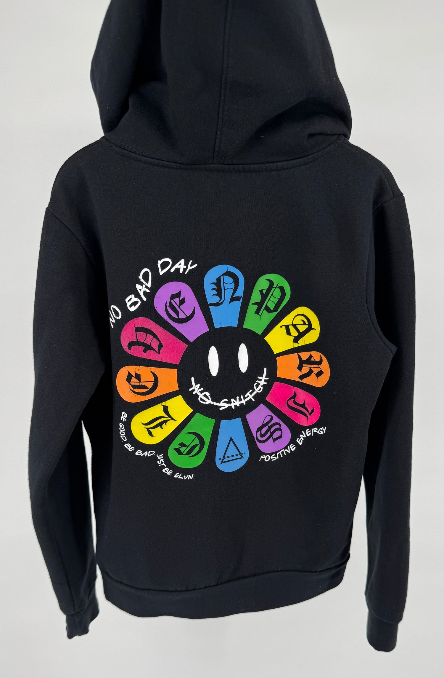 Zwart vest met capuchon van Eleven Paris in maat 152. Met blauwe ‘No Snitch’ print op de borst, sluiting met rits en twee zakken voorop en achterop een grote multi color merkprint in de de vorm van een bloem, zie foto’s.