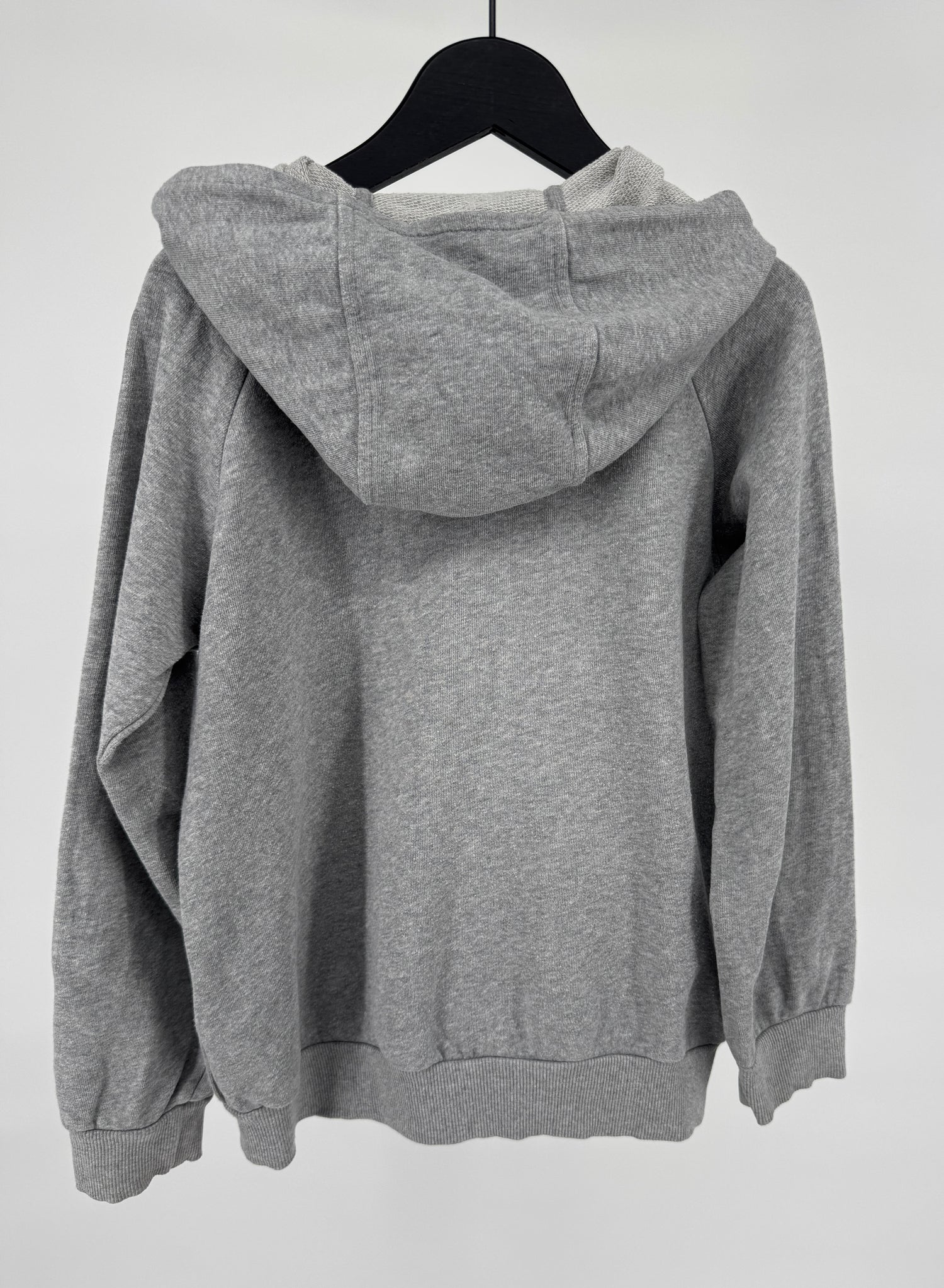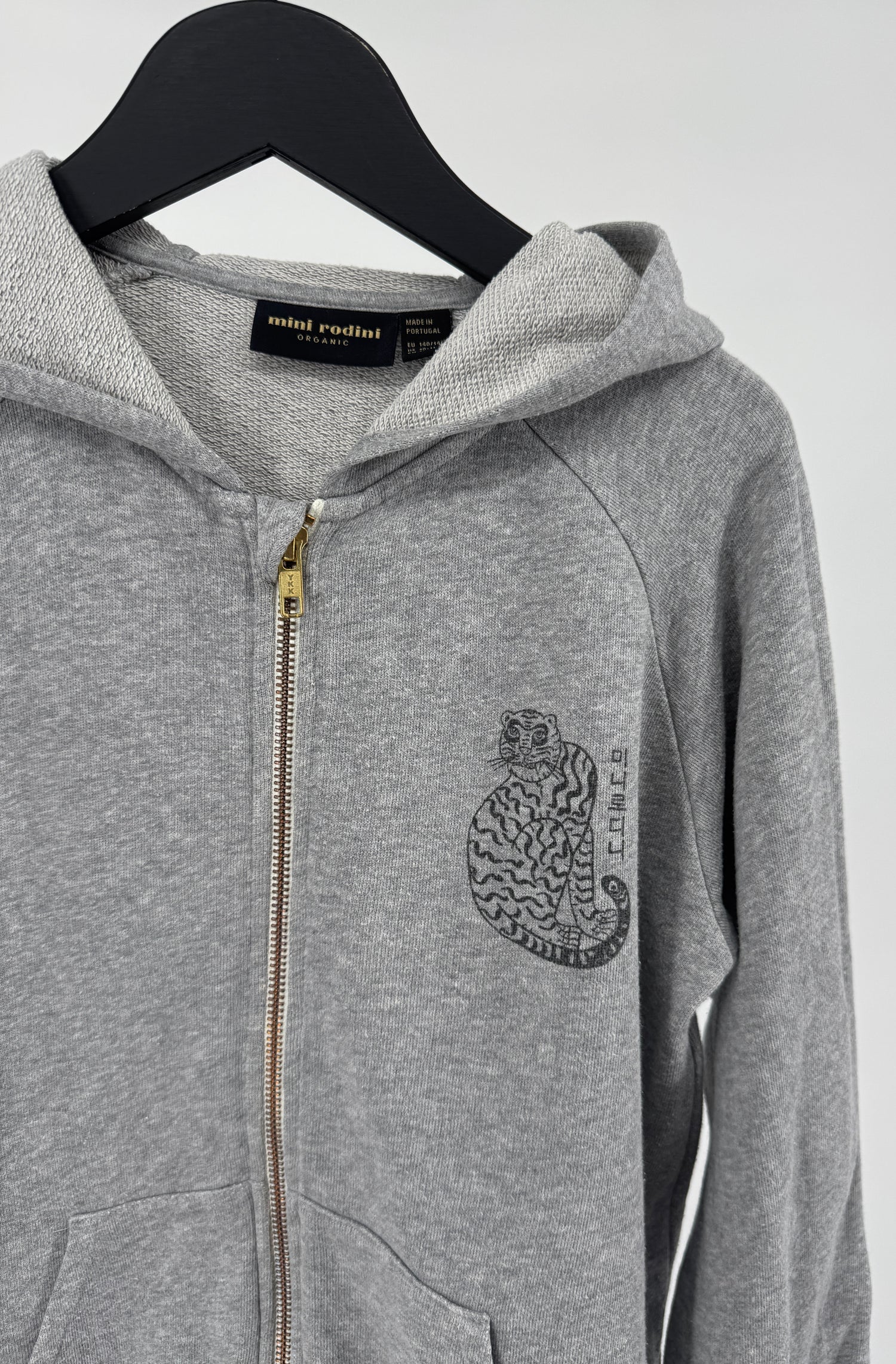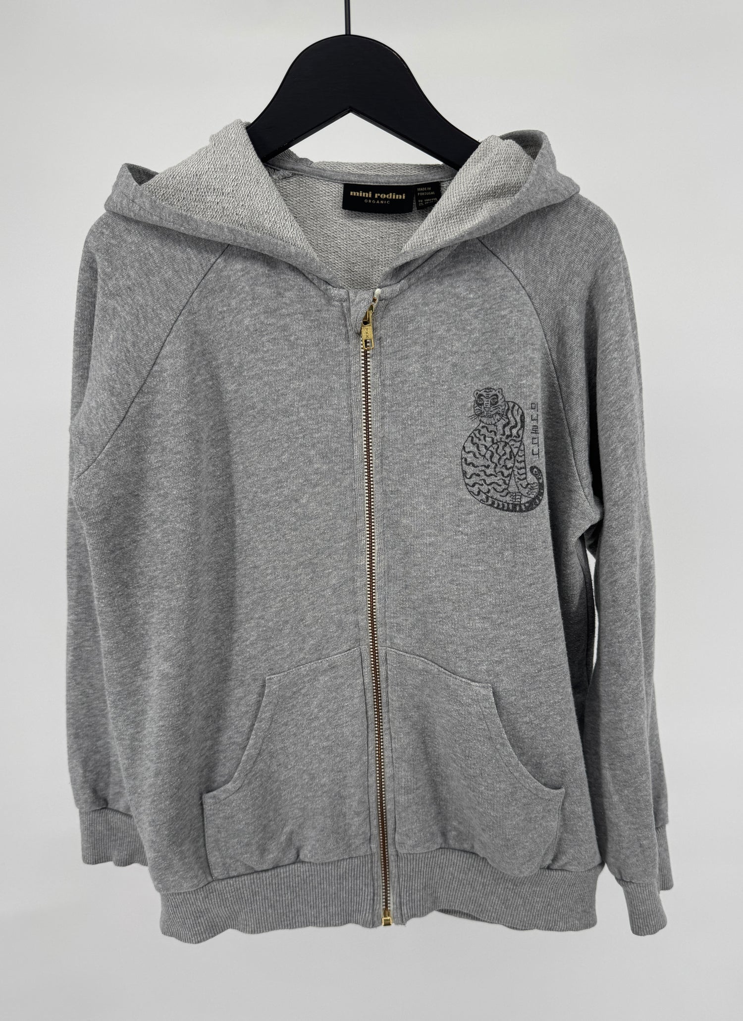 Grijs vest met capuchon van Mini Rodini in maat 140 / 146. Hij sluit met een rits, heeft een kleine zwarte print van een tijger op de borst en twee zakken, zie foto’s.