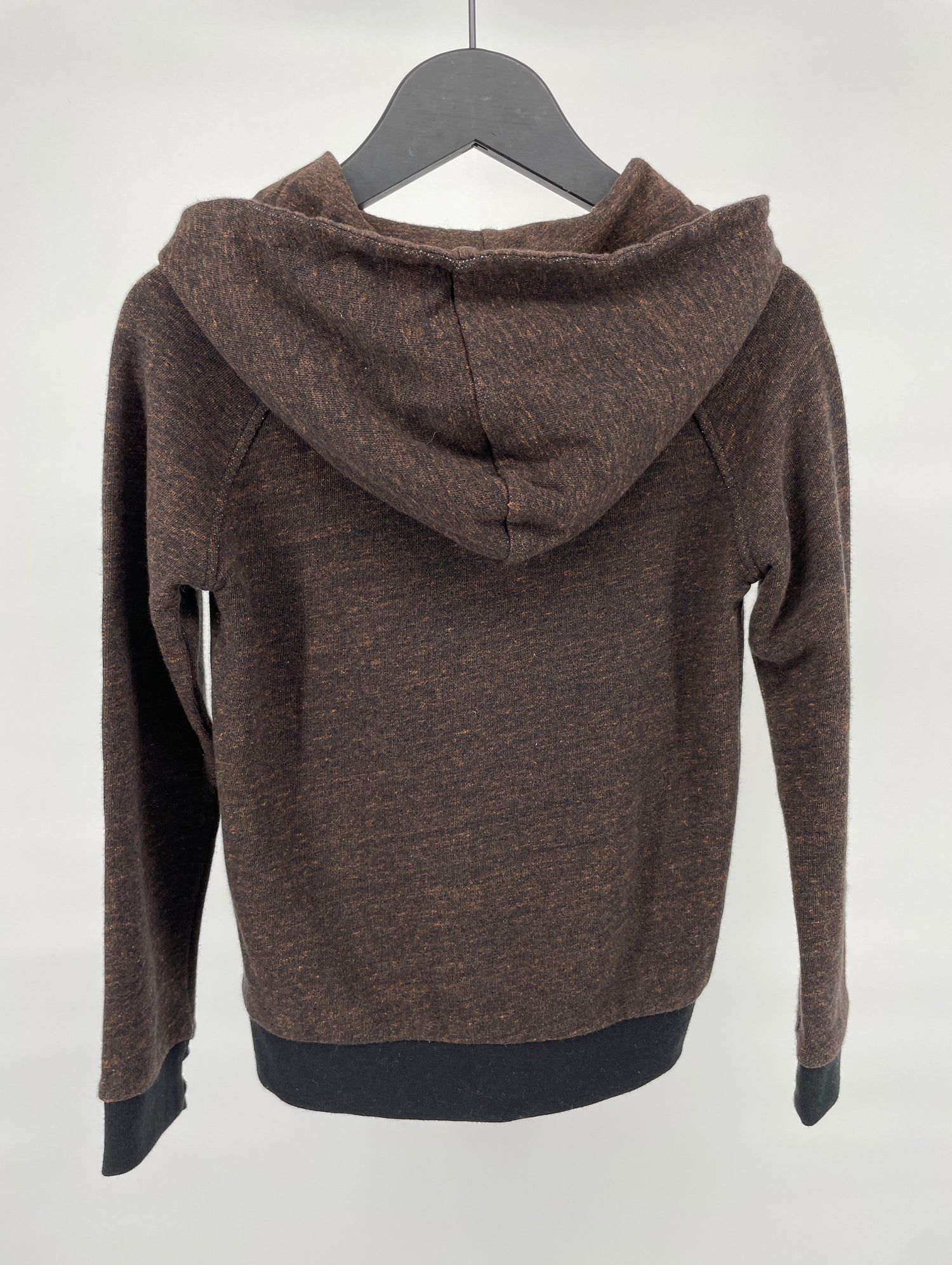 Bruin vest met capuchon van Finger in the Nose in maat 122. Het vest sluit met een rits en heeft voorop twee steekzakken. In de boorden is een duimopening opgenomen, zie foto’s.
