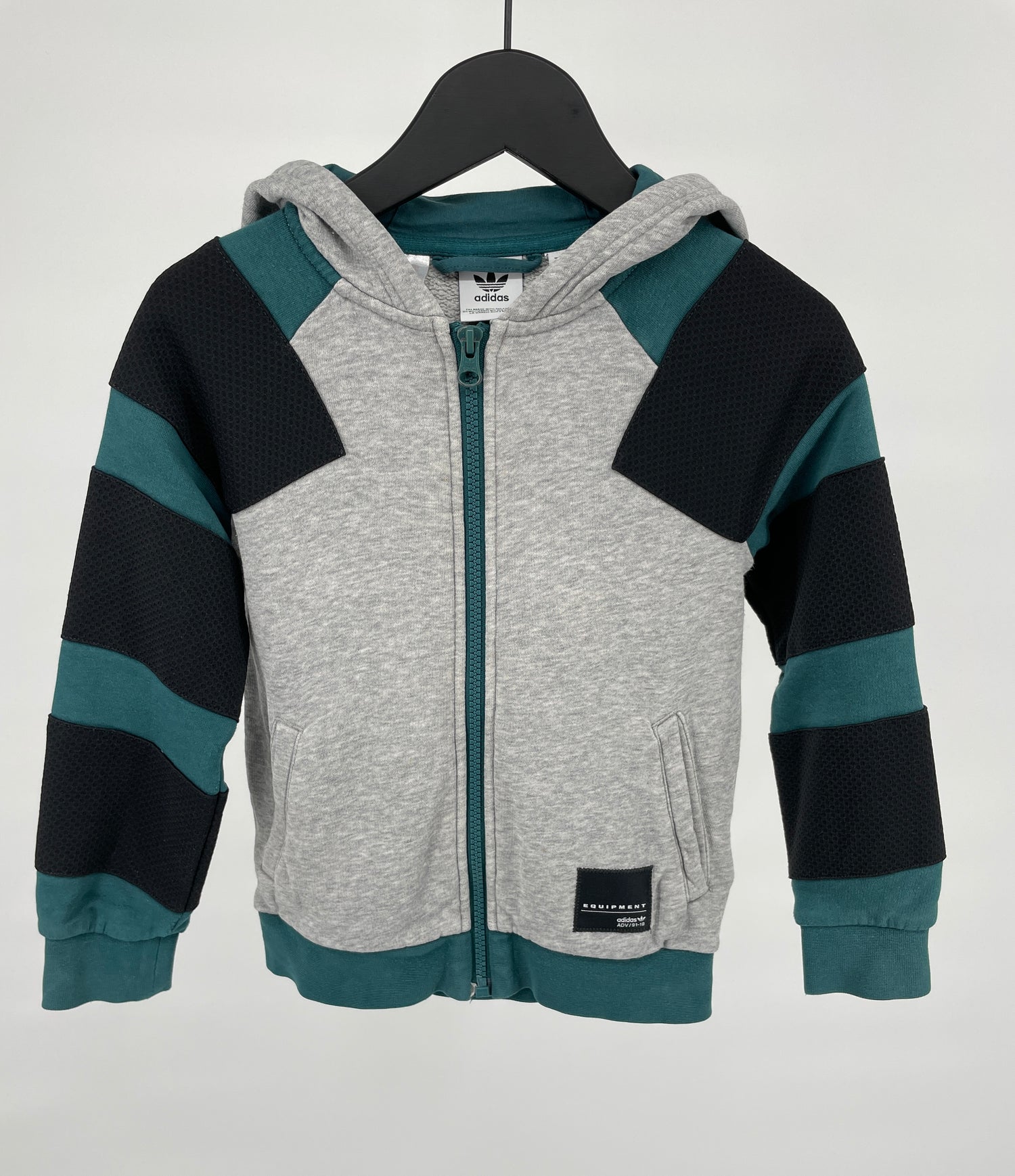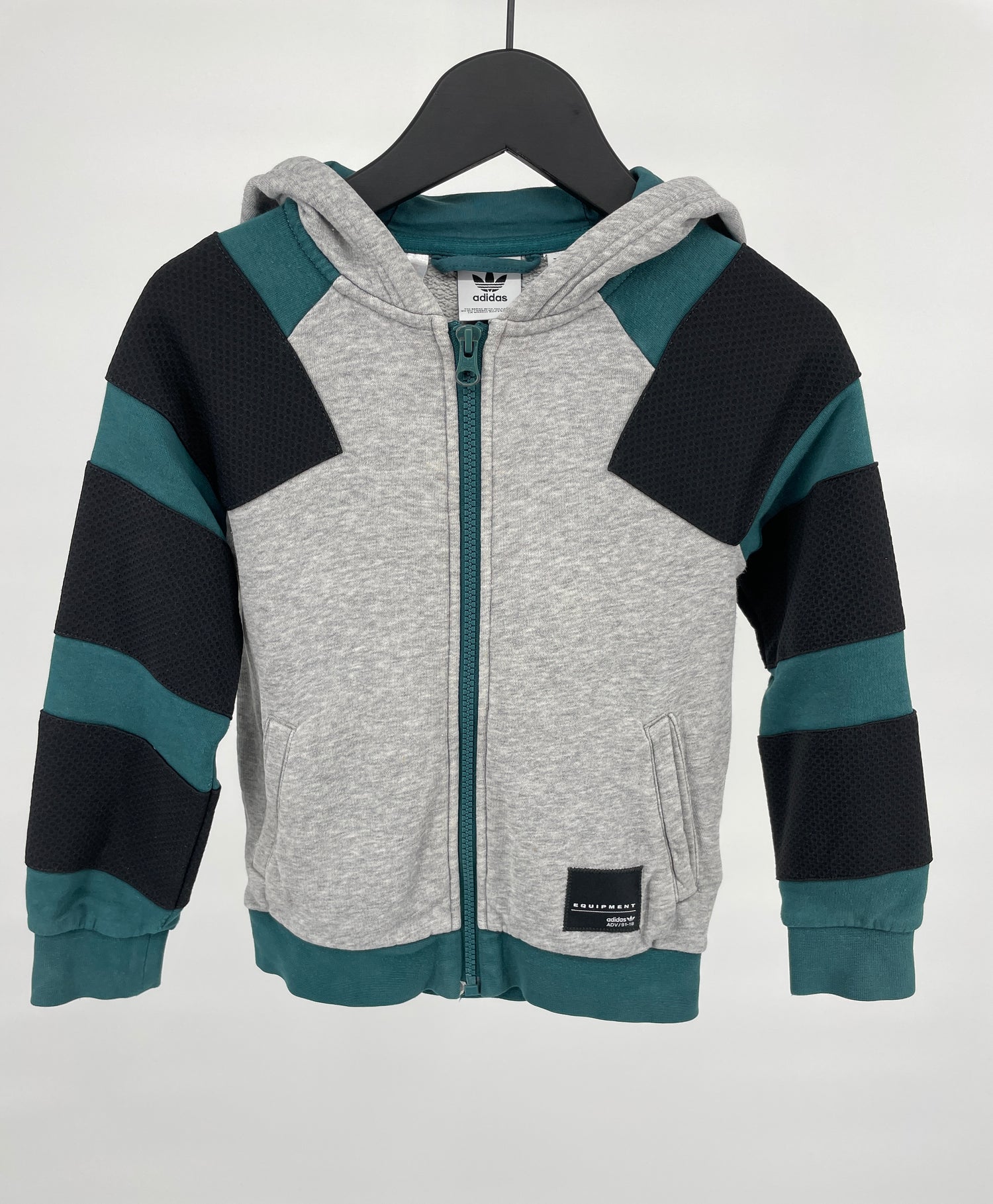 Grijs met groen en zwart vest van Adidas in maat 116. Met rits, twee zakken en gevoerde capuchon met groene stof, zie foto’s.