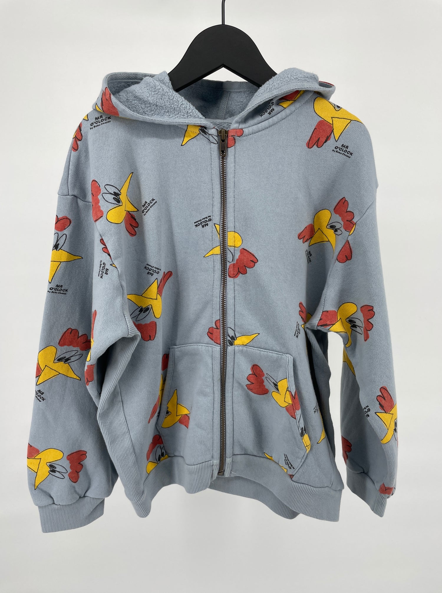 Grijs vest met capuchon van Bobo Choses in maat 140 / 146 met all over print van hanen. Hij sluit met een rits, heeft voorop twee zakken en ribstof aan beide zijkanten, zie foto’s. Gemaakt van hele zachte katoen.