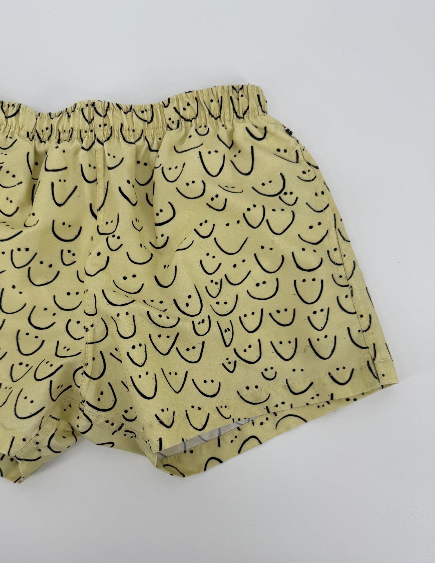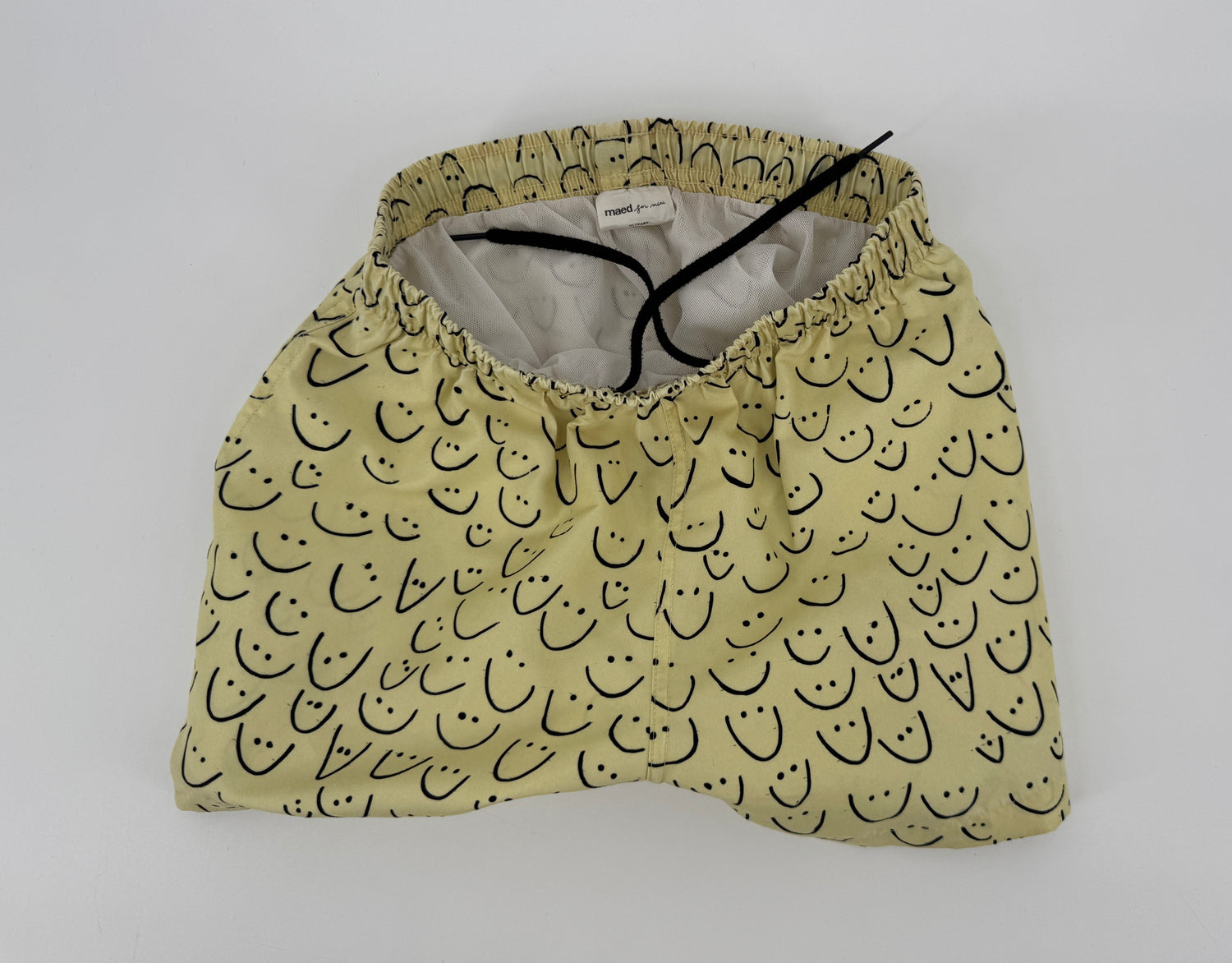 Gele zwembroek met all over smiley faces van Maed for Mini in maat 140. Met elastische tailleband, twee zakken, mesh binnenbroekje en zwart koordje om verder op maat te strikken, zie foto’s.