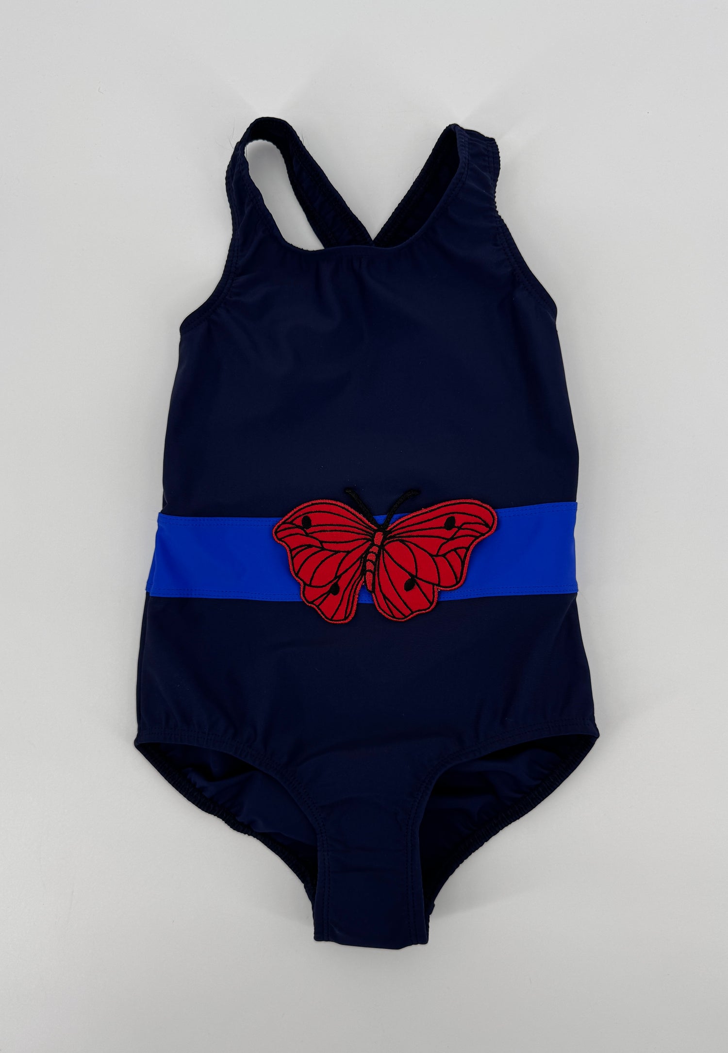 Donkerblauw badpak van Mini Rodini in maat 104 / 110. Het badpak heeft gekruiste schouderbandjes, een kobalt blauwe tailleband en voorop een rode patch van een vlinder die alleen bij het lijf is vastgezet. Met UPF 50+ bescherming.