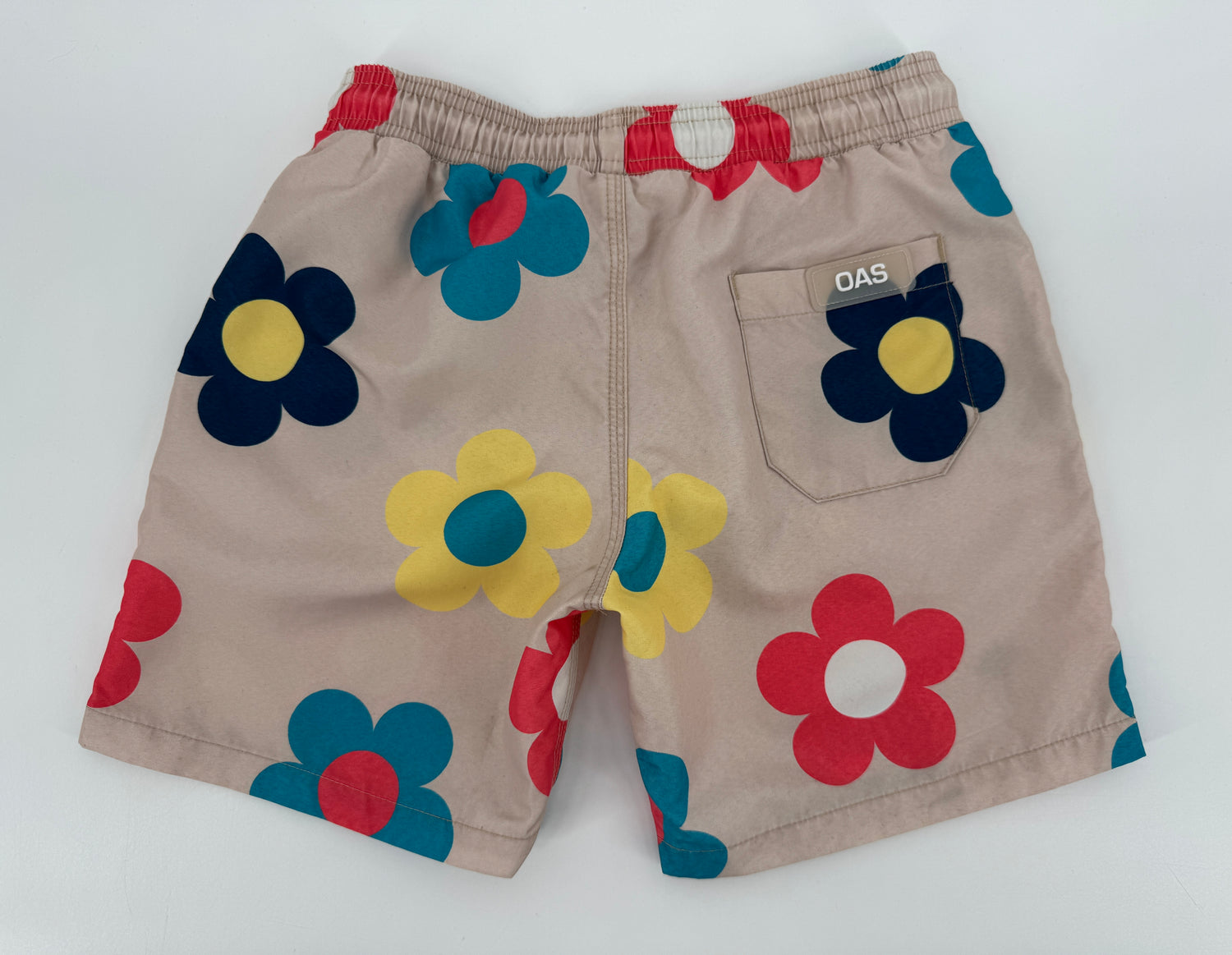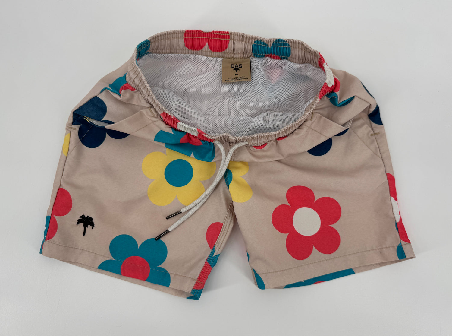 Beige zwembroek met all over bloemen print van OAS in maat 140. Met elastische tailleband en koordje, twee zakken voorop en eentje achterop. Zwart geborduurd logo van een palmboom voorop en siliconen logo achterop, zie foto’s. Binnenbroekje van witte mesh stof.